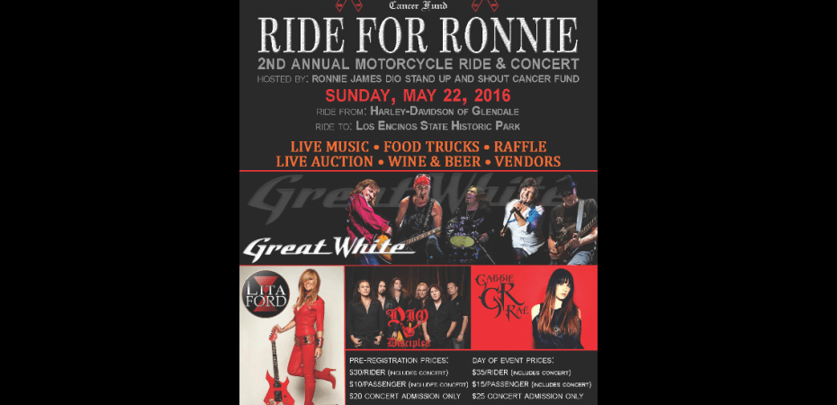 The 2nd Annual RIDE FOR RONNIE Motorcycle Ride and Concert, benefiting the Ronnie James Dio Stand Up and Shout Cancer Fund, will take place on Sunday, May 22, 2016.