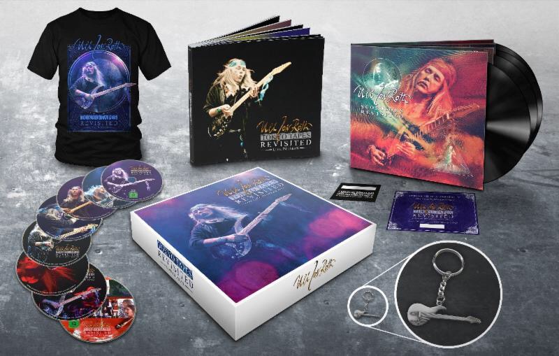 4 – A super-deluxe boxset, limited to 800 copies. It will be a proper, lid-off shell box containing 4 heavyweight vinyl LPs of Roth’s 2015 Scorpions Revisited release which has never been released on vinyl. There will also be an 80-page, gatefold, hardcover 12″ book which will house 8 discs – 1 BluRay concert main-feature, 1 bonus BluRay disc (which will contain the original footage from the first Japanese Scorpions Tour 1978, shot personally by Roth on his Super 8 Camera), 2 audio CDs of the main Tokyo concert and 4 bonus audio CDs of Roth’s Osaka and Nagoya dates on the same Japanese tour. The set will also include an ULI JON ROTH replica guitar key-ring, a t-shirt, and a signed certificate of authenticity, numbered and signed by Roth himself.