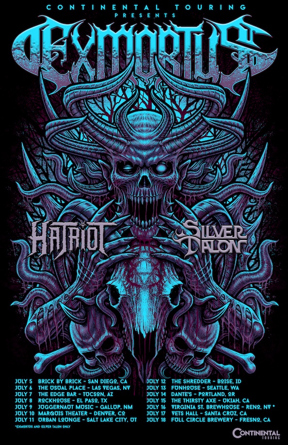 Exmortus are bringing out a couple of fine support acts of their own for these dates – Bay Area thrashers Hatriot (whose fourth album, “The Vale of Shadows,” releases July 22nd on Massacre Records and features two sons of Exodus frontman Steve Souza) and Portland’s dark power metallers Silver Talon who are touring in support of “Decadence and Decay,” their praised debut full-length on M-Theory Audio and who recently performed at Vancouver’s Hyperspace Festival and Chicago’s Legions of Metal.
