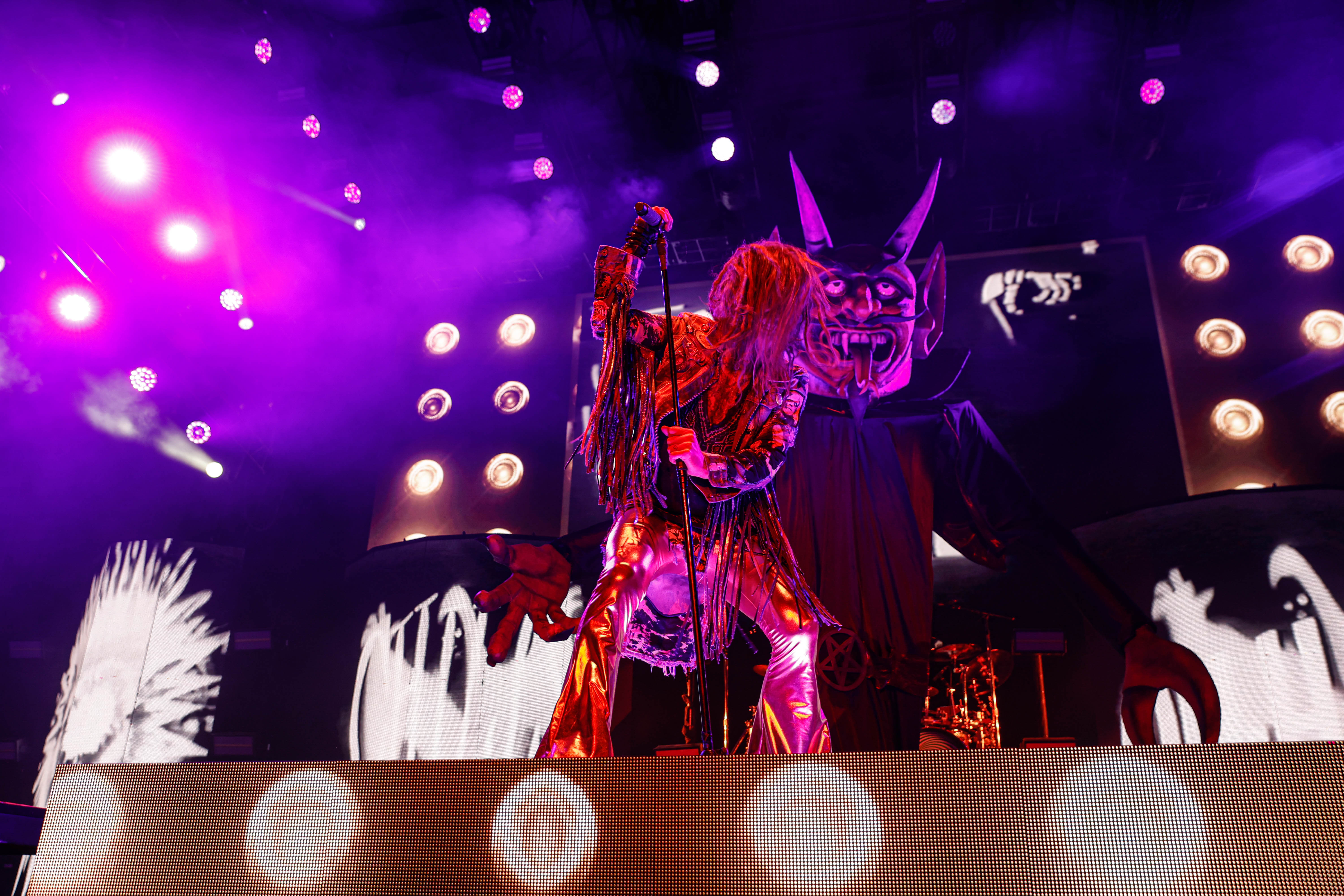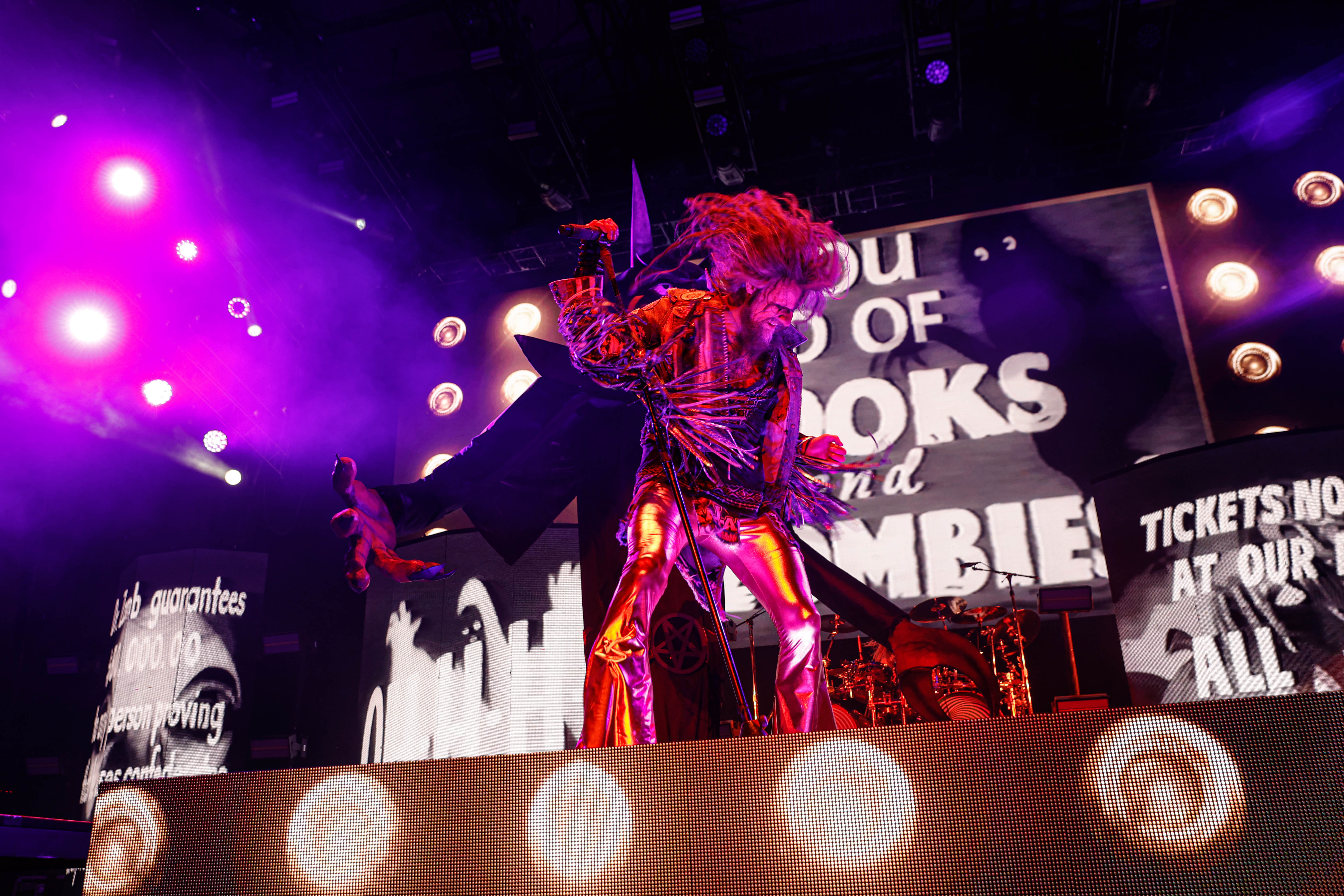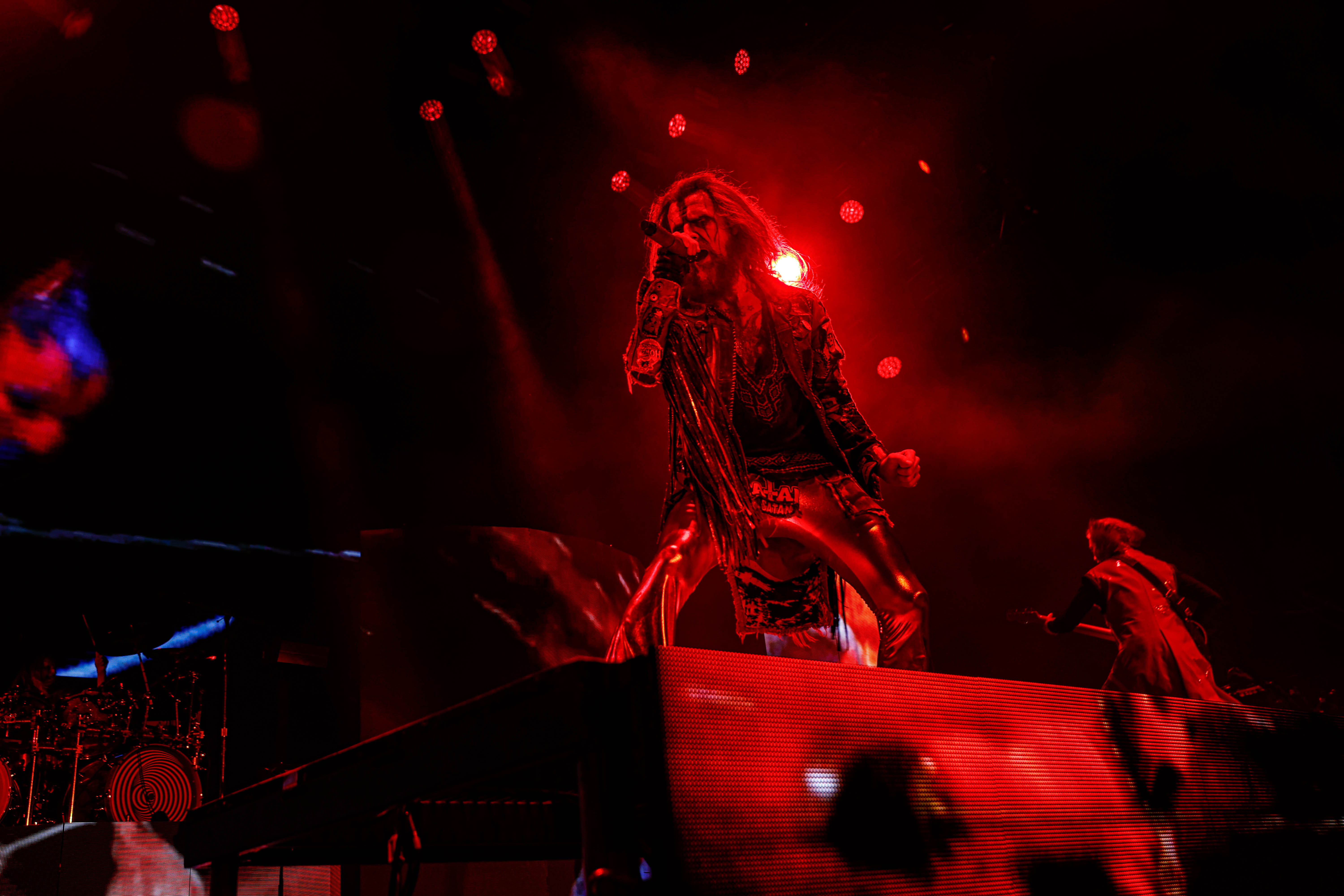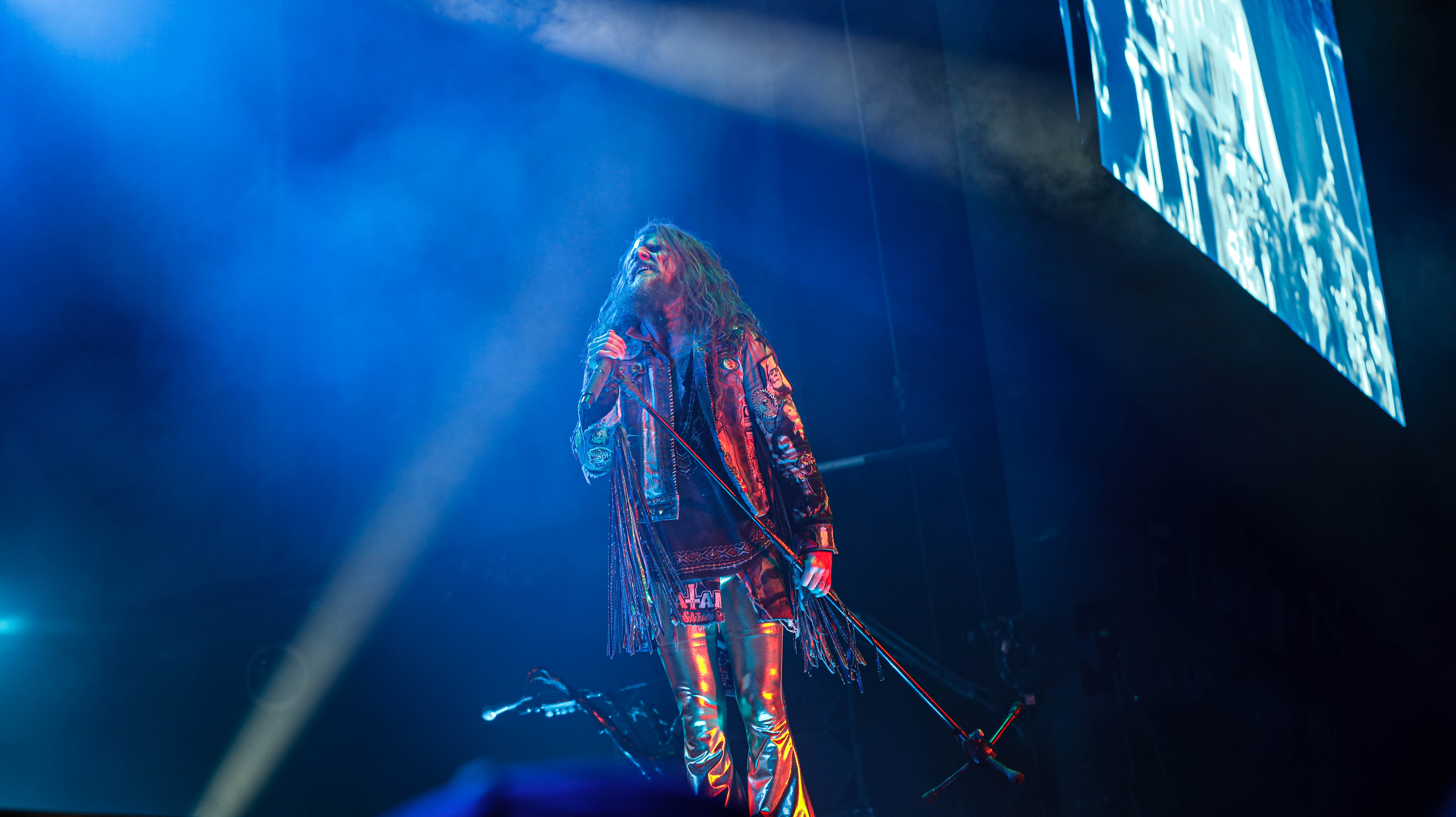 Now it was time for the final act of the night, none other than Rob Zombie. Zombie founded White Zombie in 1985 and in the groups 13 years together released four albums. Zombie would continue as a solo artist releasing his first album Hellbilly Deluxe: 13 Tales of Cadaverous Cavorting Inside the Spookshow International in 1998. Two years after his second solo album The Sinister Urge, Zombie direced, wrote, and made the music for his first film House Of 1000 Corpses. Zombie would then direct, produce, and write his next film The Devil’s Rejects. Zombie would release another five albums with the latest being The Lunar Injection Kool Aid Eclipse Conspiracy (2021). Zombie also made another nine films with the latest being The Munsters released this year. Former Marilyn Manson guitarist John 5 has been with Zombie since 2005 and in 2006 bassist Piggy D. who was previously with Wednesday 13 joined. In 2011 former Manson drummer Ginger Fish joined and this has been Zombie’s band since then all together. Zombie began the show with “The Triumph of King Freak (A Crypt of Preservation and Superstition)” on top of a big fixture with his name spelled out. On the next song “Superbeast” Zombie came down and ran across the risers back and forth as well as John 5 and Piggy D. This intense set included a total of 17 songs including Zombie’s biggest hits “House Of 1000 Corpses,” White Zombies “More Human Than Human,” “Thunder Kiss ‘65,” and covers of the Ramones “Blitzkrieg Bop,” and Grand Funk Railroad’s “Were an American Band,” before ending with “Shadows of the Cemetery Man,” and “Dragula.”