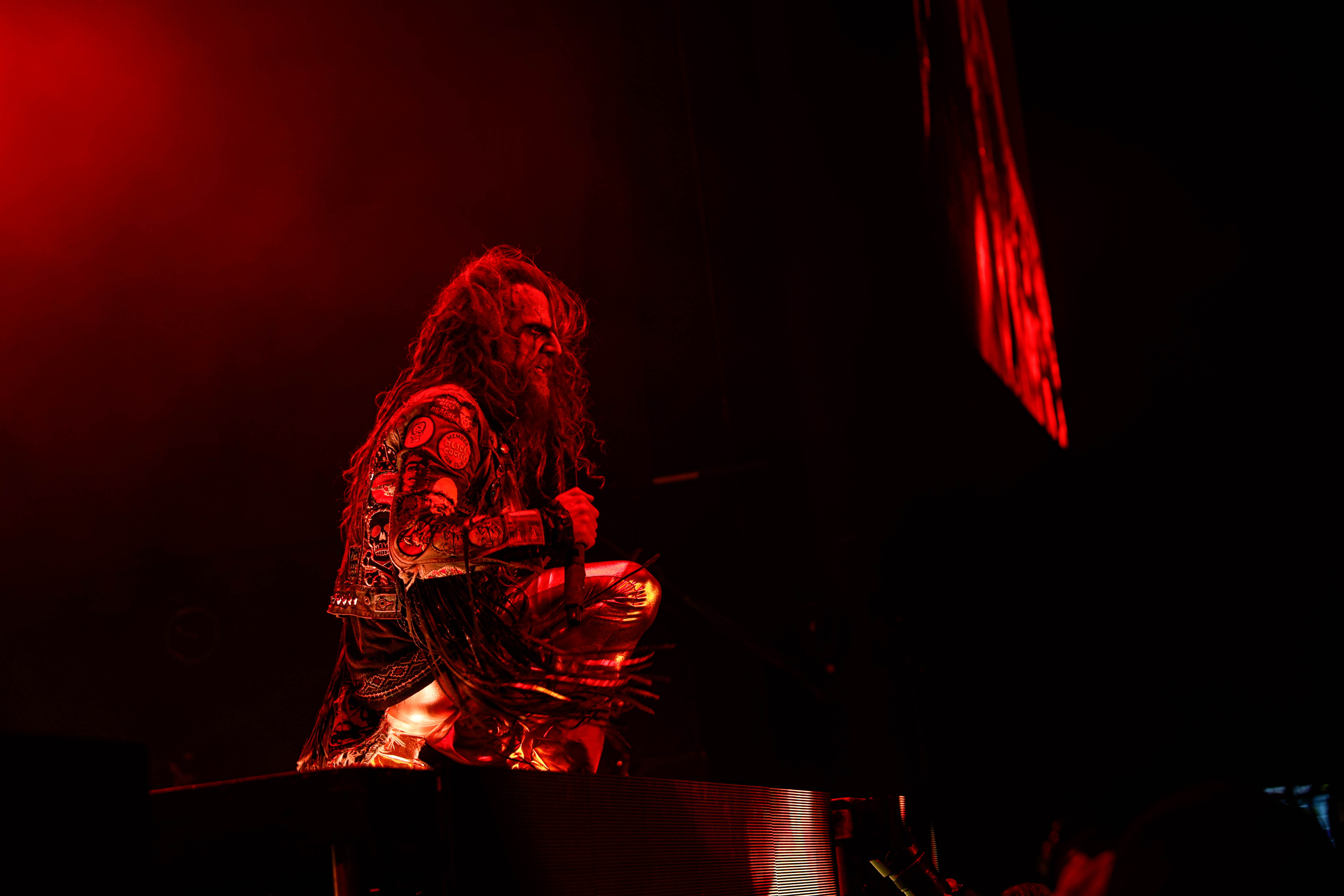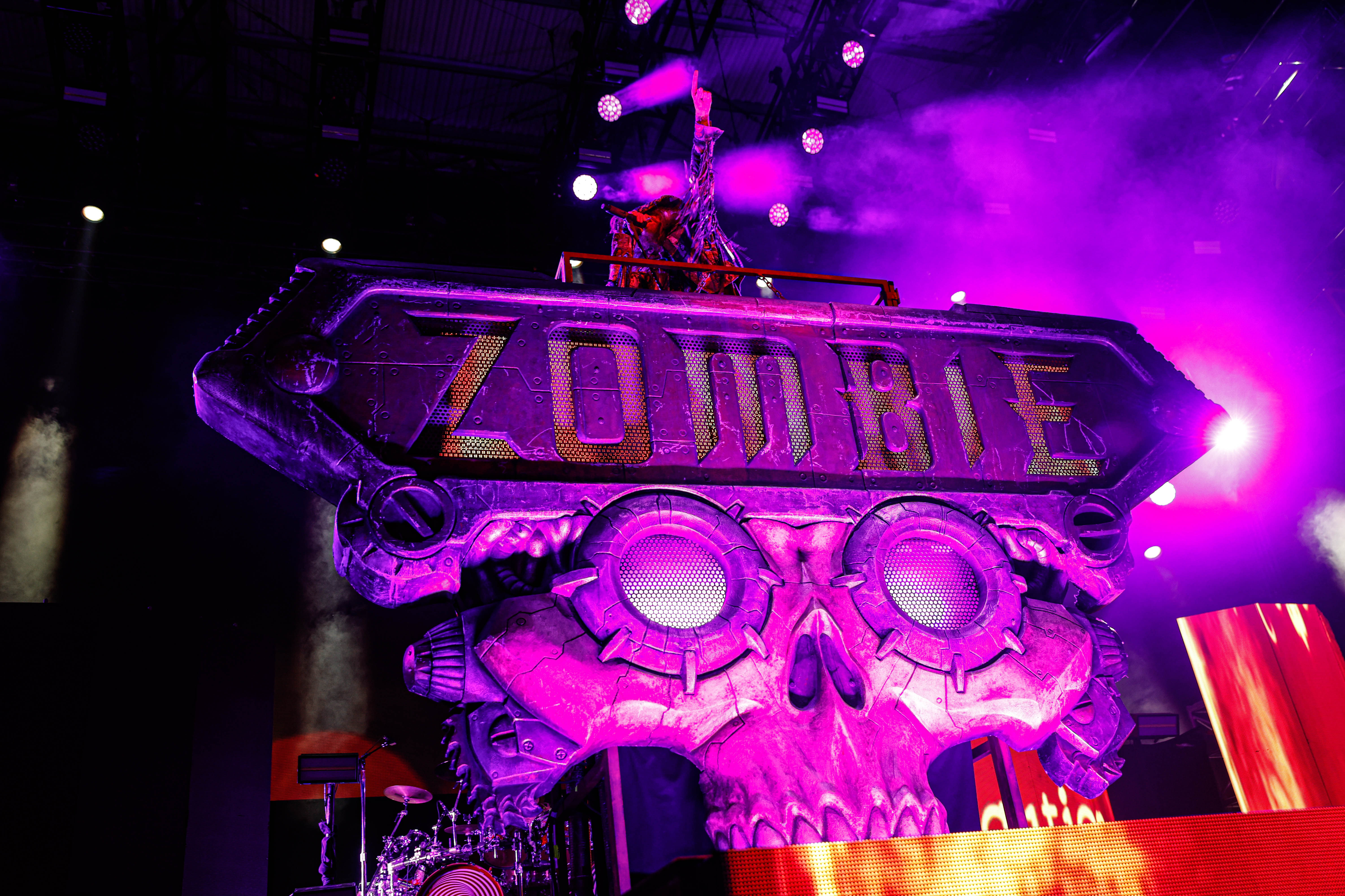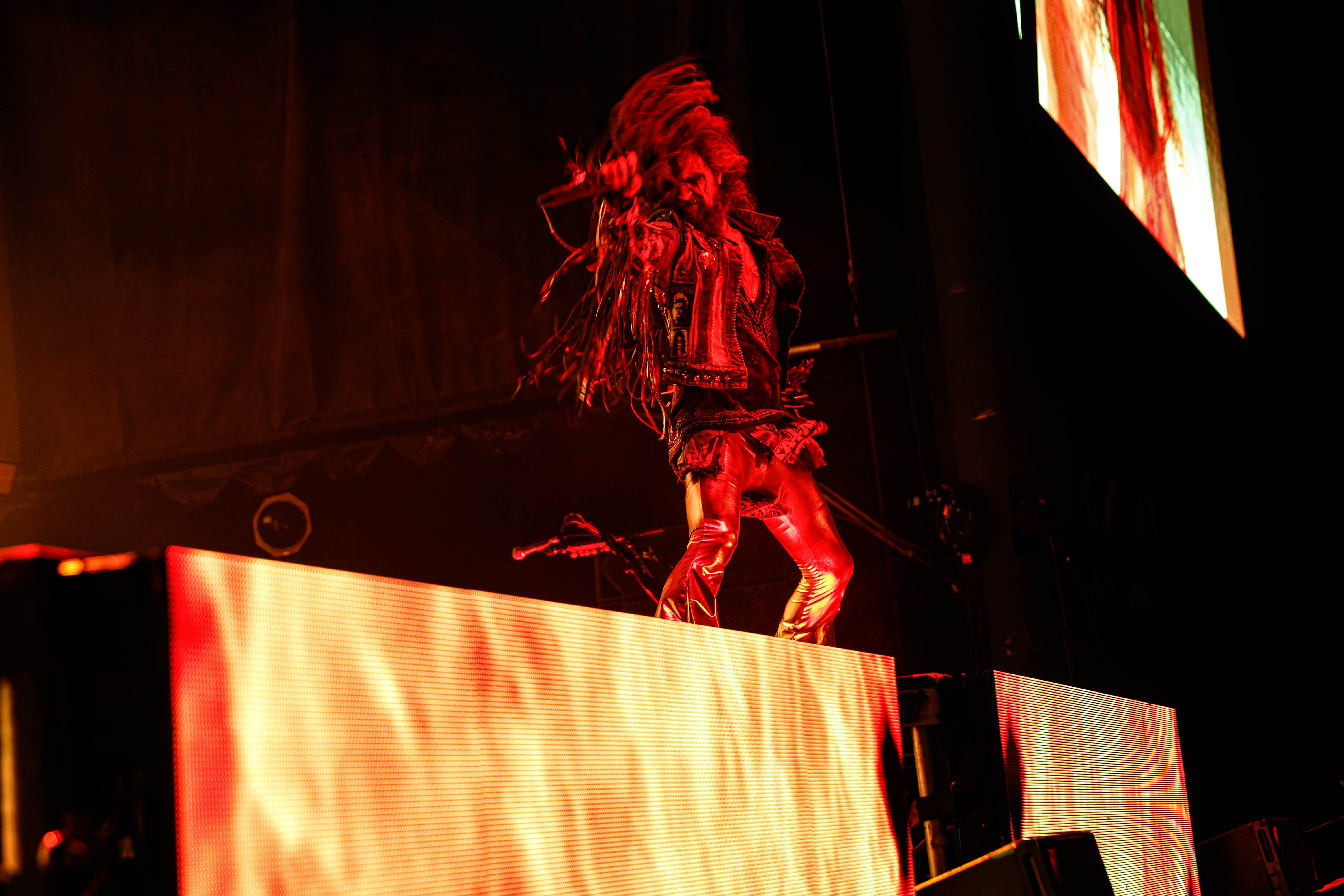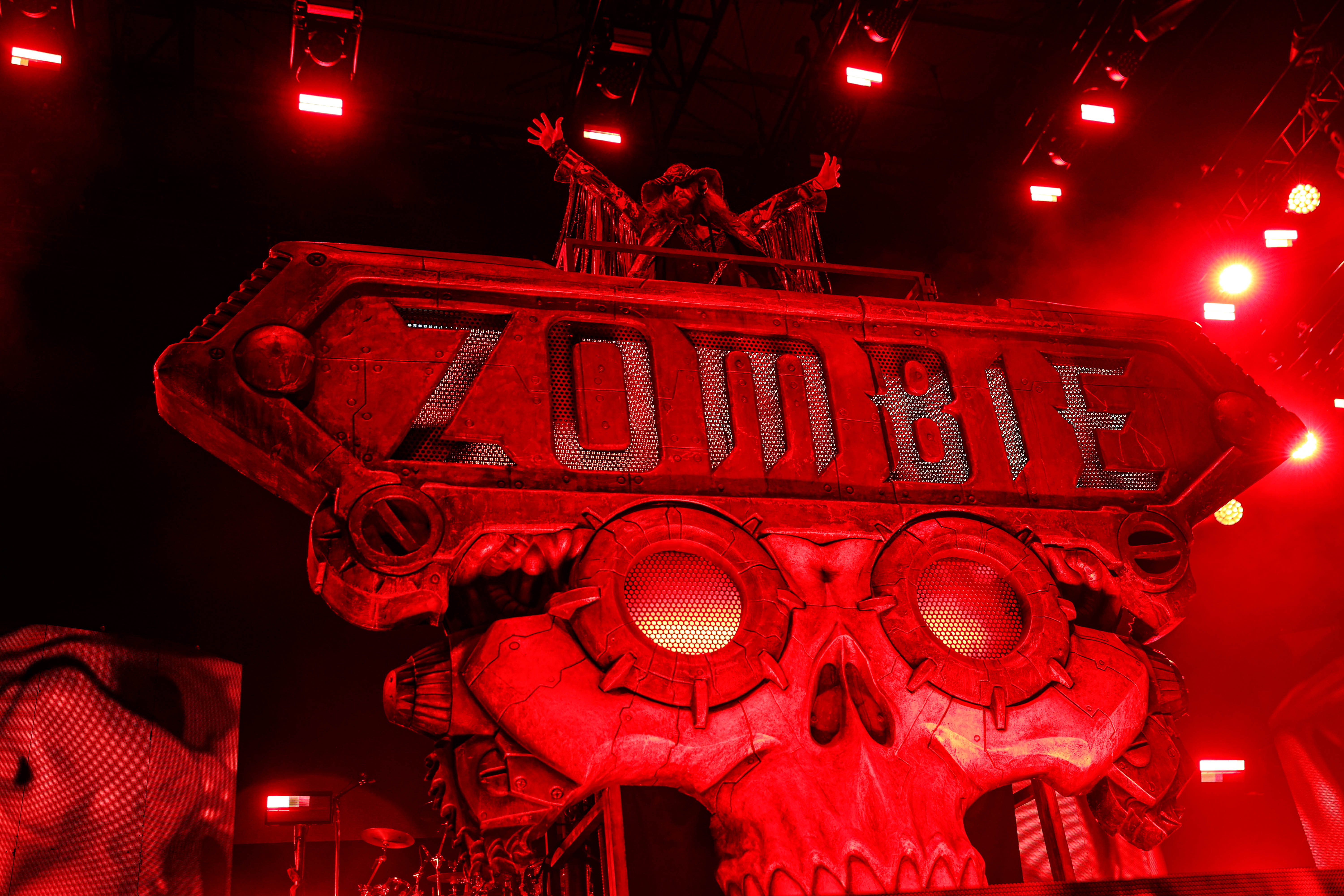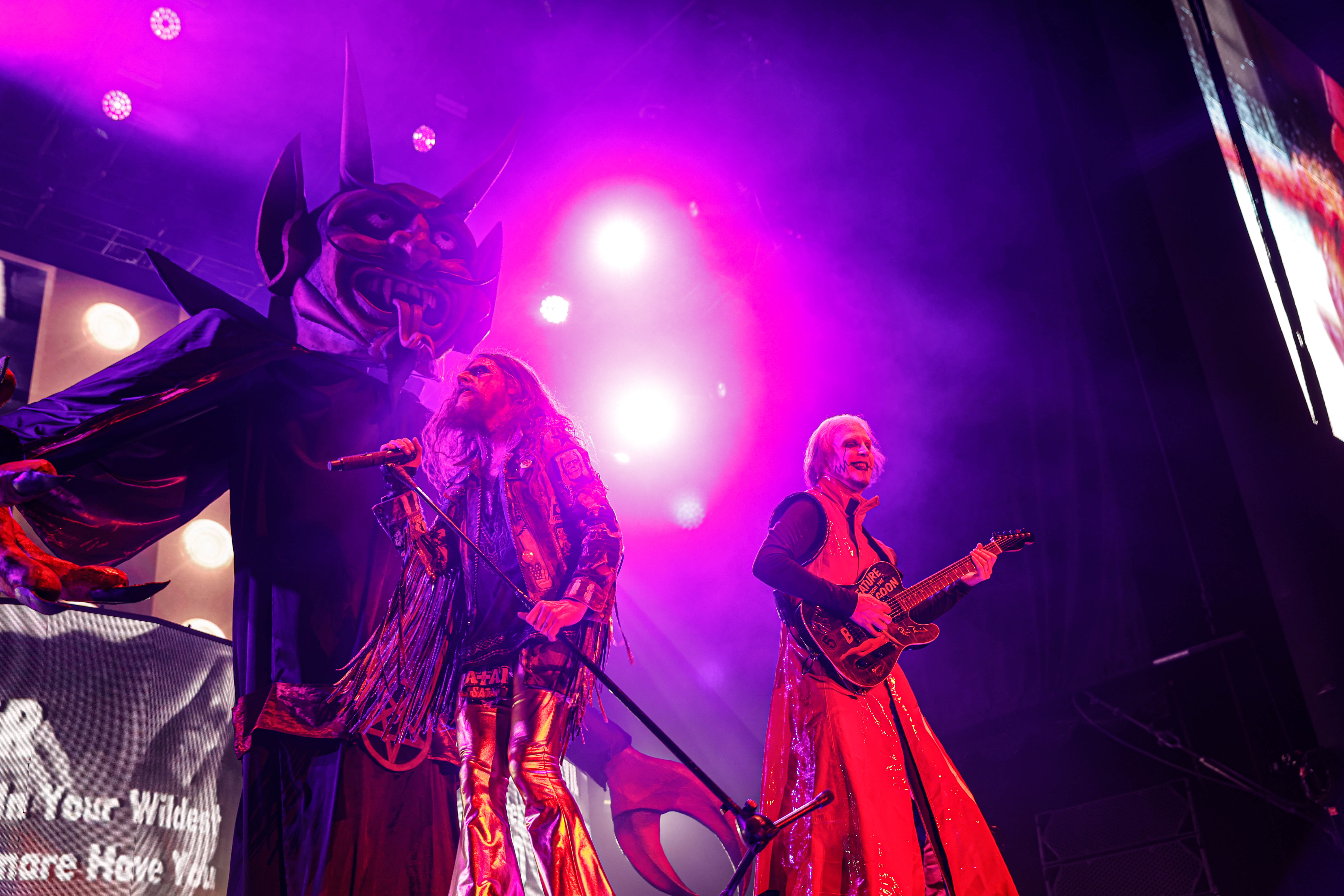 Now it was time for the final act of the night, none other than Rob Zombie. Zombie founded White Zombie in 1985 and in the groups 13 years together released four albums. Zombie would continue as a solo artist releasing his first album Hellbilly Deluxe: 13 Tales of Cadaverous Cavorting Inside the Spookshow International in 1998. Two years after his second solo album The Sinister Urge, Zombie direced, wrote, and made the music for his first film House Of 1000 Corpses. Zombie would then direct, produce, and write his next film The Devil’s Rejects. Zombie would release another five albums with the latest being The Lunar Injection Kool Aid Eclipse Conspiracy (2021). Zombie also made another nine films with the latest being The Munsters released this year. Former Marilyn Manson guitarist John 5 has been with Zombie since 2005 and in 2006 bassist Piggy D. who was previously with Wednesday 13 joined. In 2011 former Manson drummer Ginger Fish joined and this has been Zombie’s band since then all together. Zombie began the show with “The Triumph of King Freak (A Crypt of Preservation and Superstition)” on top of a big fixture with his name spelled out. On the next song “Superbeast” Zombie came down and ran across the risers back and forth as well as John 5 and Piggy D. This intense set included a total of 17 songs including Zombie’s biggest hits “House Of 1000 Corpses,” White Zombies “More Human Than Human,” “Thunder Kiss ‘65,” and covers of the Ramones “Blitzkrieg Bop,” and Grand Funk Railroad’s “Were an American Band,” before ending with “Shadows of the Cemetery Man,” and “Dragula.”