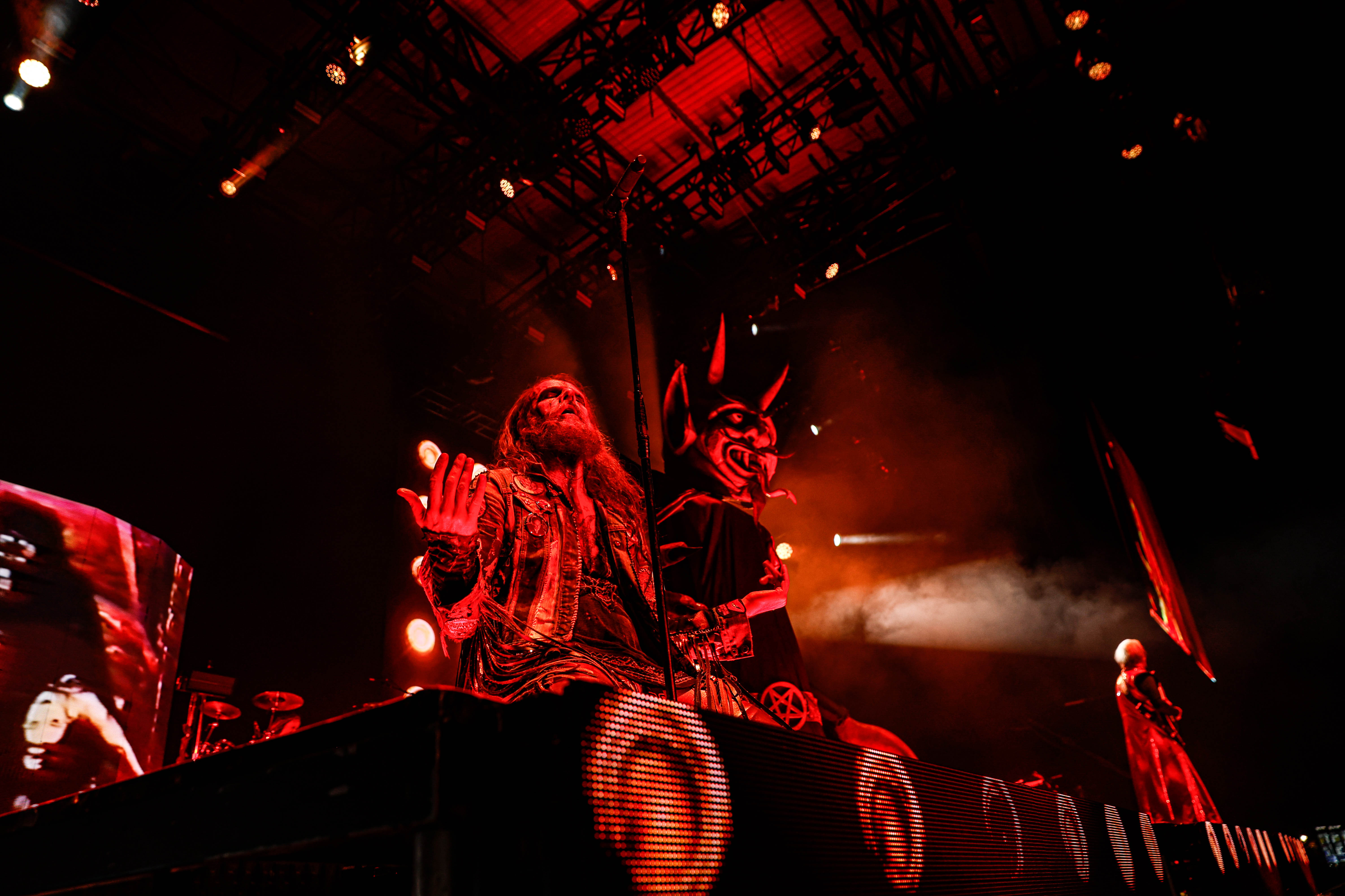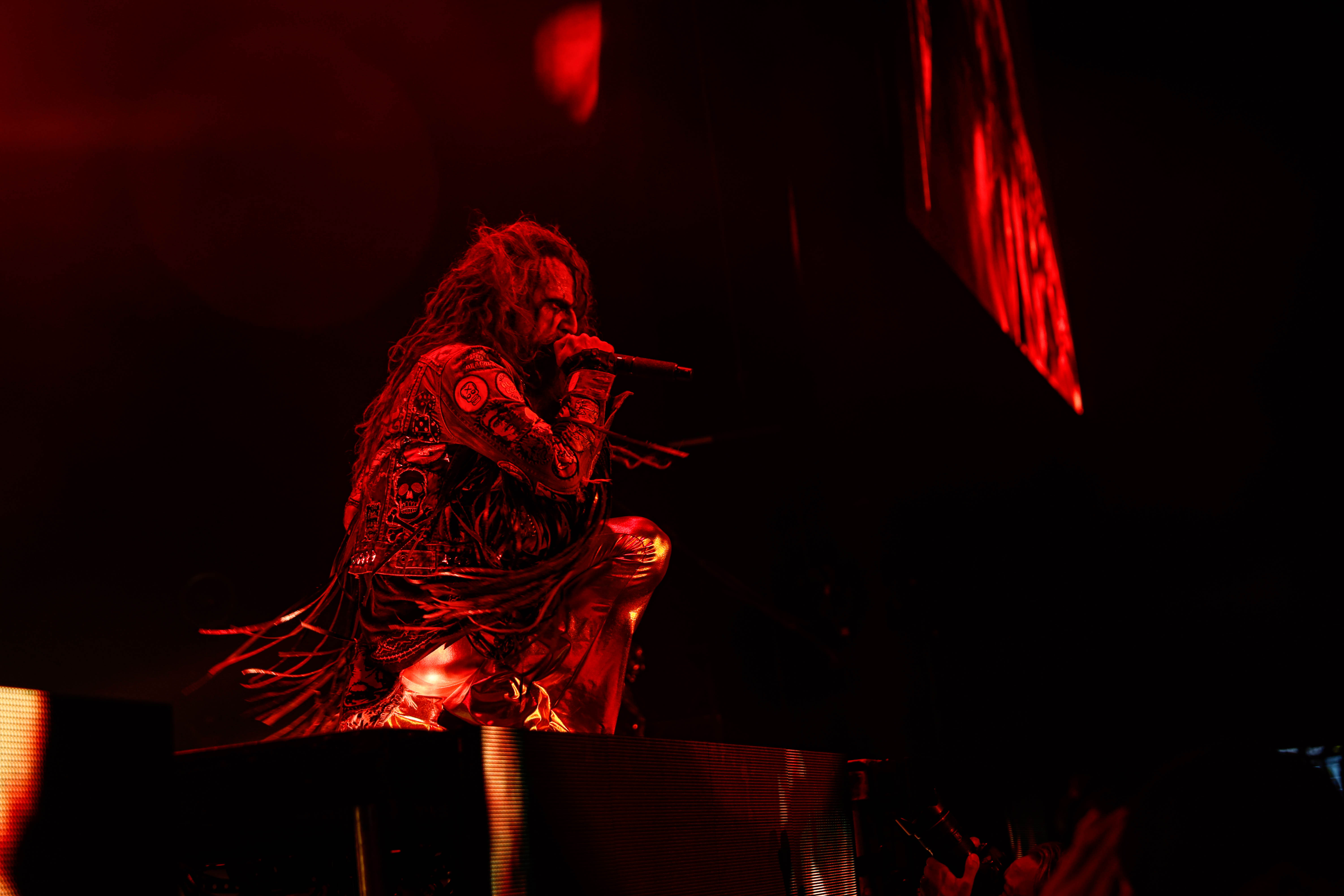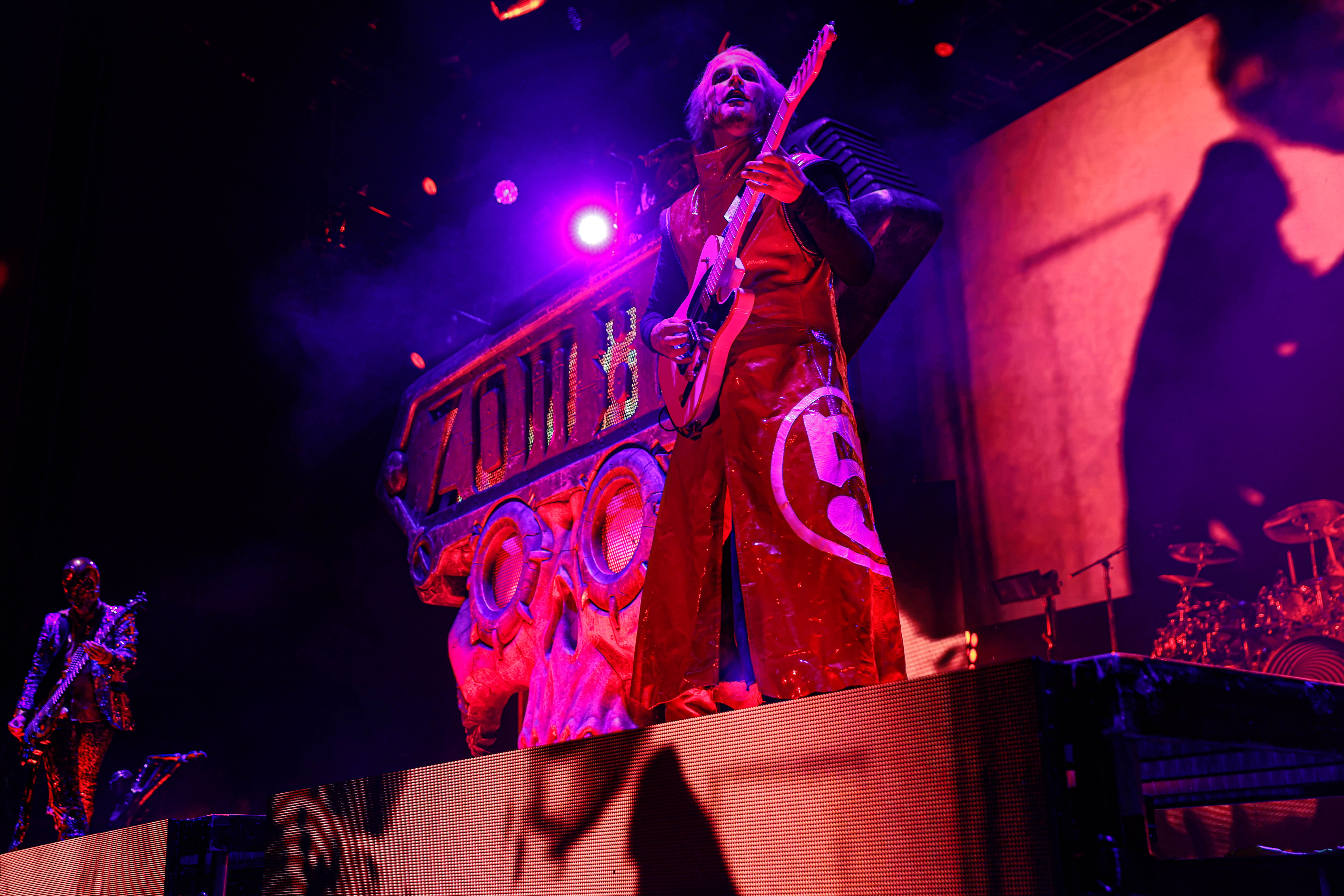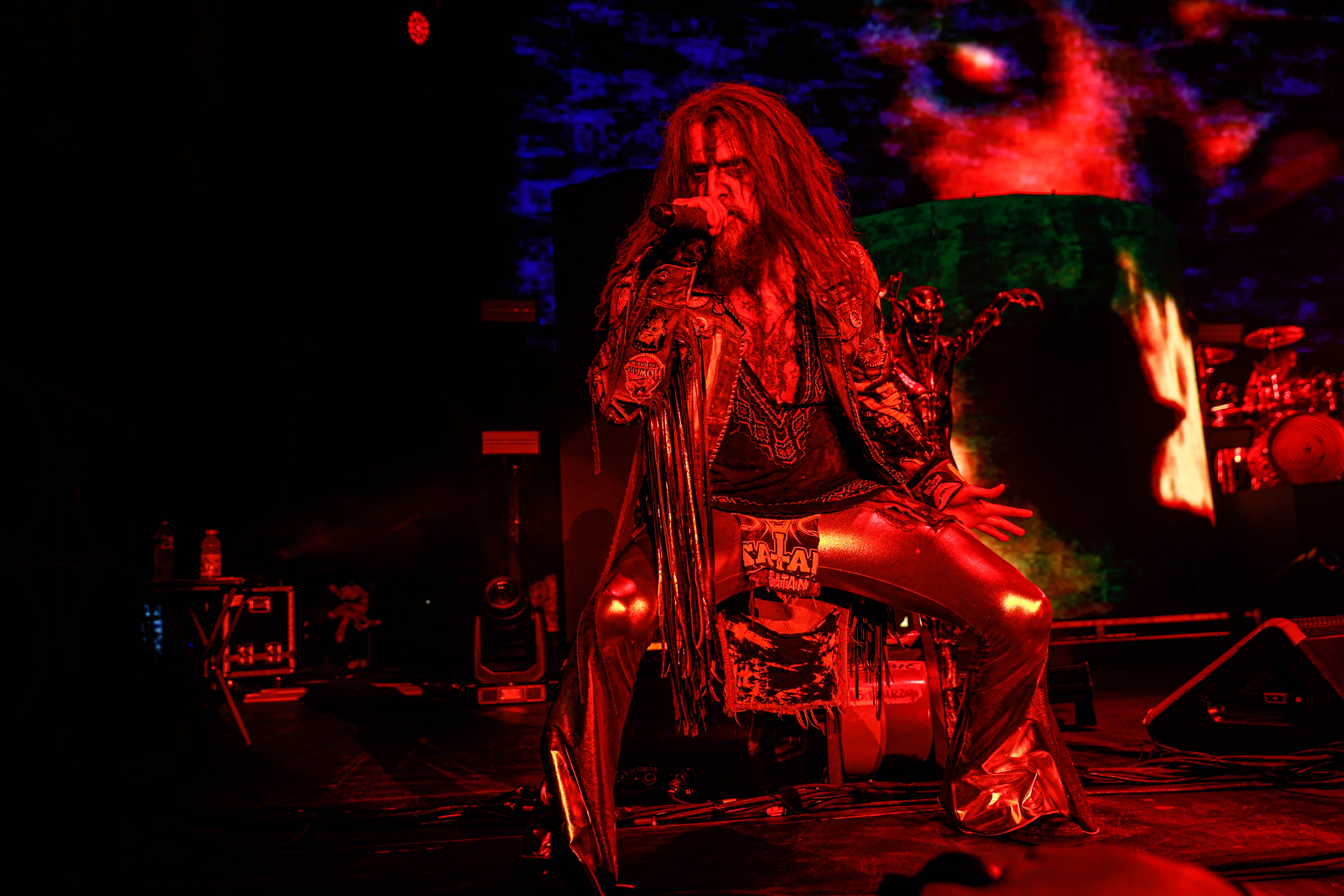 Now it was time for the final act of the night, none other than Rob Zombie. Zombie founded White Zombie in 1985 and in the groups 13 years together released four albums. Zombie would continue as a solo artist releasing his first album Hellbilly Deluxe: 13 Tales of Cadaverous Cavorting Inside the Spookshow International in 1998. Two years after his second solo album The Sinister Urge, Zombie direced, wrote, and made the music for his first film House Of 1000 Corpses. Zombie would then direct, produce, and write his next film The Devil’s Rejects. Zombie would release another five albums with the latest being The Lunar Injection Kool Aid Eclipse Conspiracy (2021). Zombie also made another nine films with the latest being The Munsters released this year. Former Marilyn Manson guitarist John 5 has been with Zombie since 2005 and in 2006 bassist Piggy D. who was previously with Wednesday 13 joined. In 2011 former Manson drummer Ginger Fish joined and this has been Zombie’s band since then all together. Zombie began the show with “The Triumph of King Freak (A Crypt of Preservation and Superstition)” on top of a big fixture with his name spelled out. On the next song “Superbeast” Zombie came down and ran across the risers back and forth as well as John 5 and Piggy D. This intense set included a total of 17 songs including Zombie’s biggest hits “House Of 1000 Corpses,” White Zombies “More Human Than Human,” “Thunder Kiss ‘65,” and covers of the Ramones “Blitzkrieg Bop,” and Grand Funk Railroad’s “Were an American Band,” before ending with “Shadows of the Cemetery Man,” and “Dragula.”