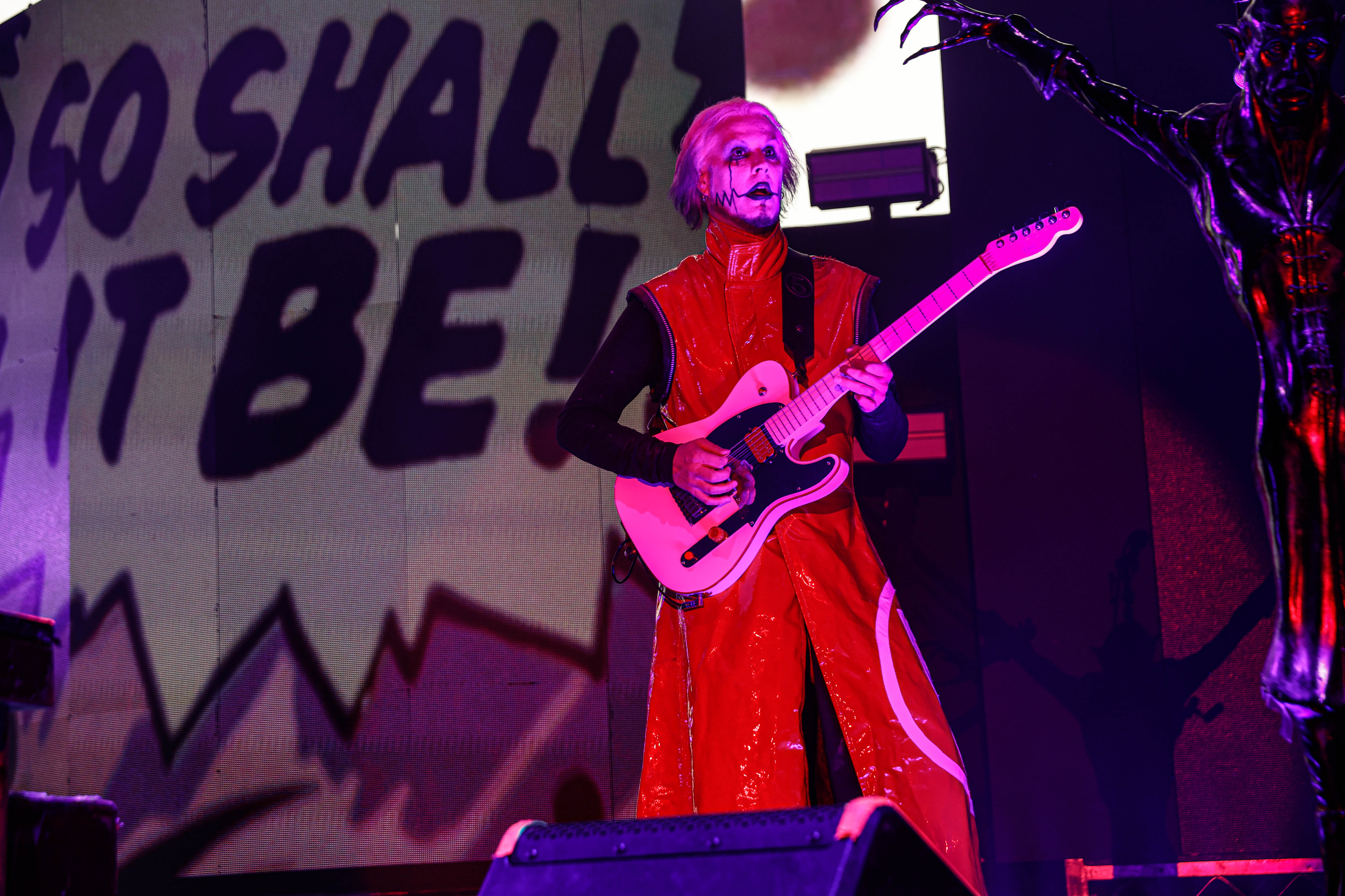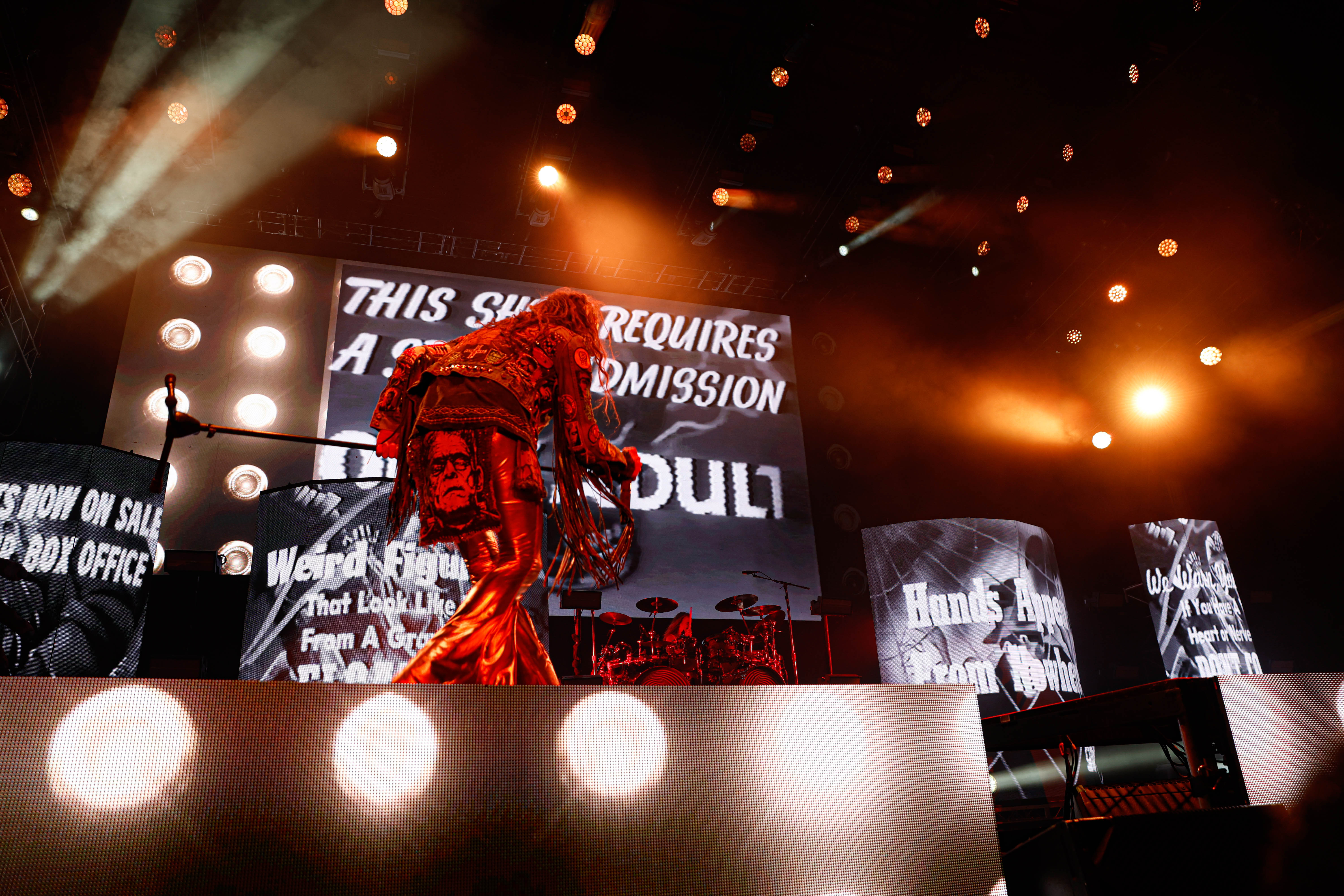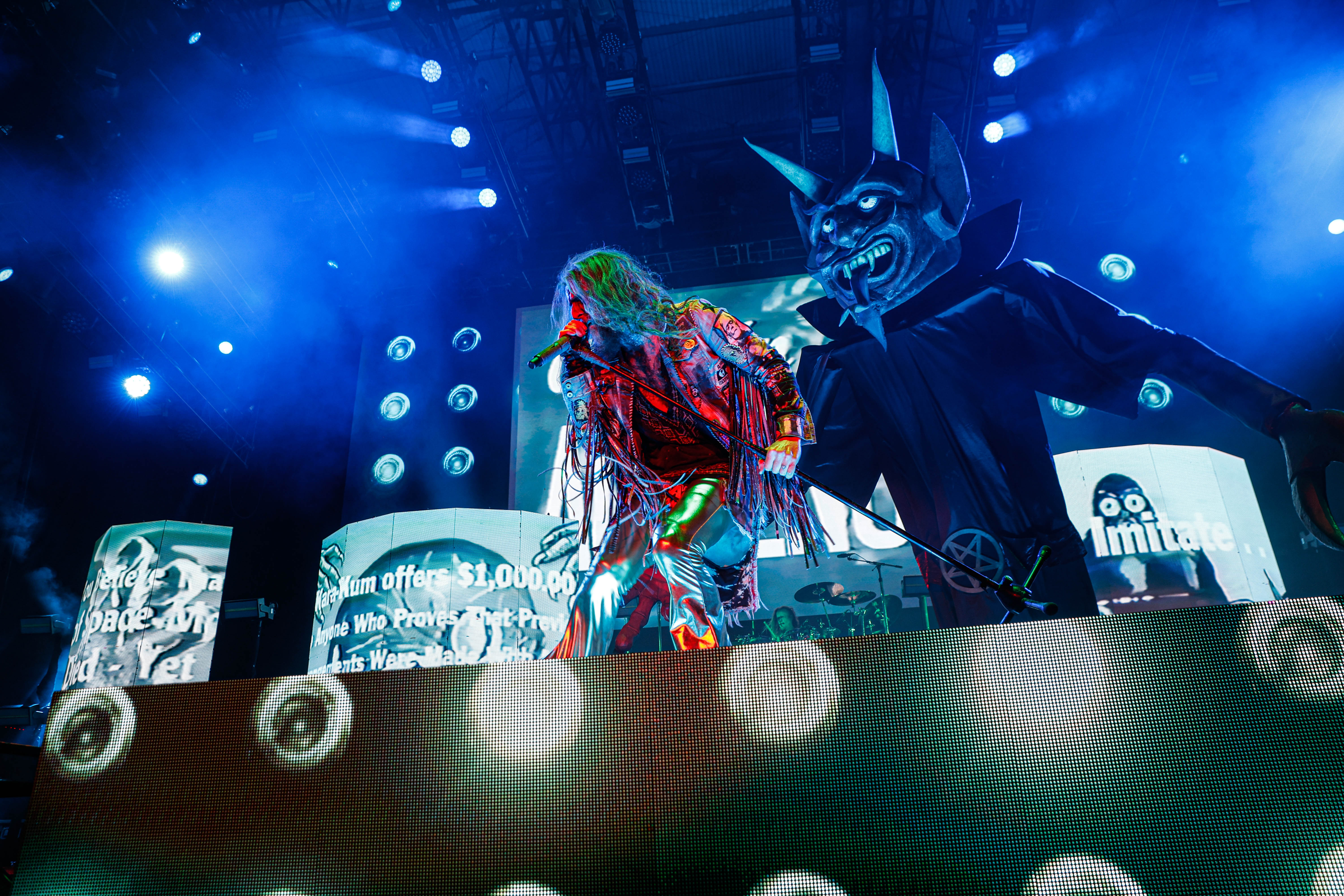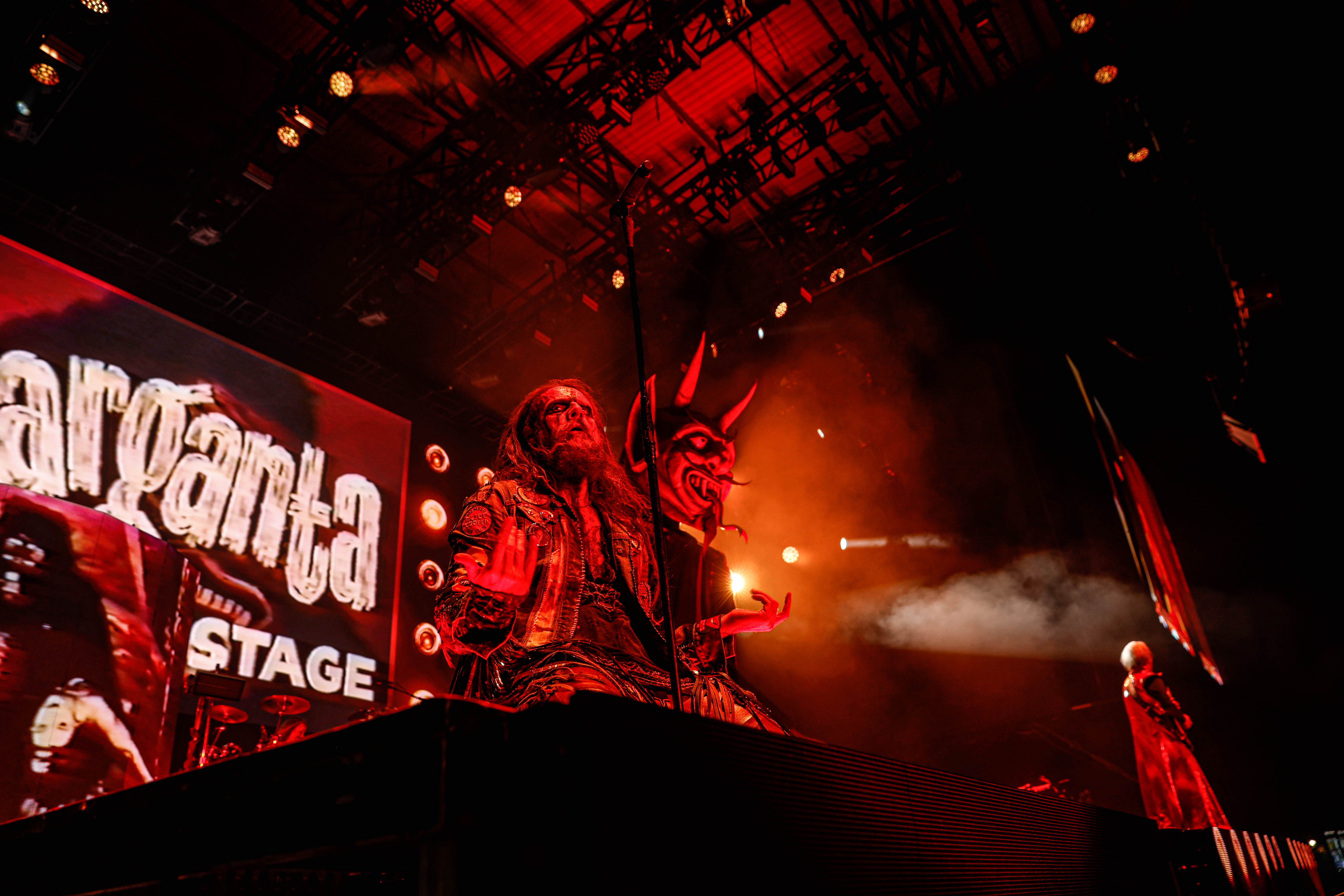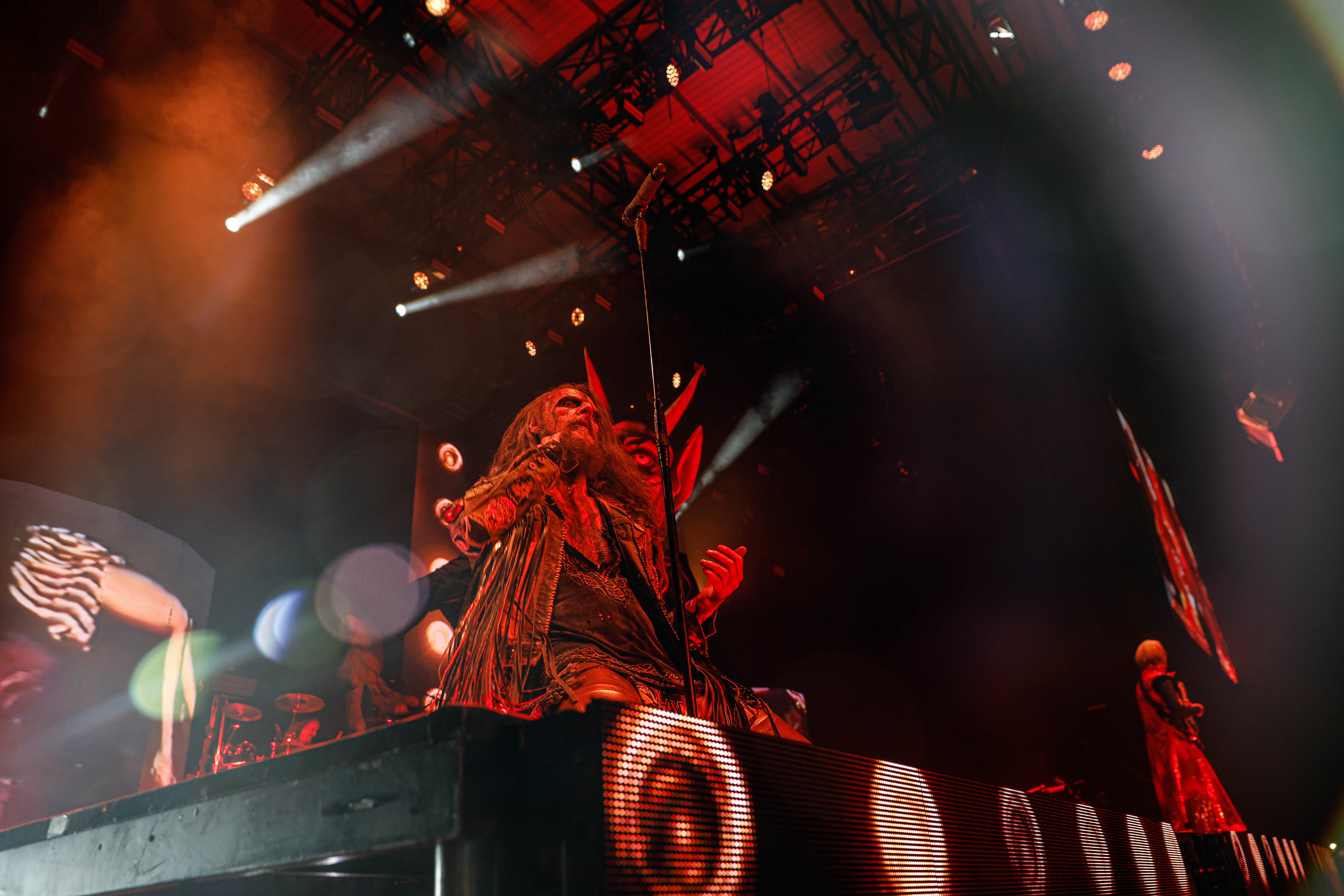 Now it was time for the final act of the night, none other than Rob Zombie. Zombie founded White Zombie in 1985 and in the groups 13 years together released four albums. Zombie would continue as a solo artist releasing his first album Hellbilly Deluxe: 13 Tales of Cadaverous Cavorting Inside the Spookshow International in 1998. Two years after his second solo album The Sinister Urge, Zombie direced, wrote, and made the music for his first film House Of 1000 Corpses. Zombie would then direct, produce, and write his next film The Devil’s Rejects. Zombie would release another five albums with the latest being The Lunar Injection Kool Aid Eclipse Conspiracy (2021). Zombie also made another nine films with the latest being The Munsters released this year. Former Marilyn Manson guitarist John 5 has been with Zombie since 2005 and in 2006 bassist Piggy D. who was previously with Wednesday 13 joined. In 2011 former Manson drummer Ginger Fish joined and this has been Zombie’s band since then all together. Zombie began the show with “The Triumph of King Freak (A Crypt of Preservation and Superstition)” on top of a big fixture with his name spelled out. On the next song “Superbeast” Zombie came down and ran across the risers back and forth as well as John 5 and Piggy D. This intense set included a total of 17 songs including Zombie’s biggest hits “House Of 1000 Corpses,” White Zombies “More Human Than Human,” “Thunder Kiss ‘65,” and covers of the Ramones “Blitzkrieg Bop,” and Grand Funk Railroad’s “Were an American Band,” before ending with “Shadows of the Cemetery Man,” and “Dragula.”