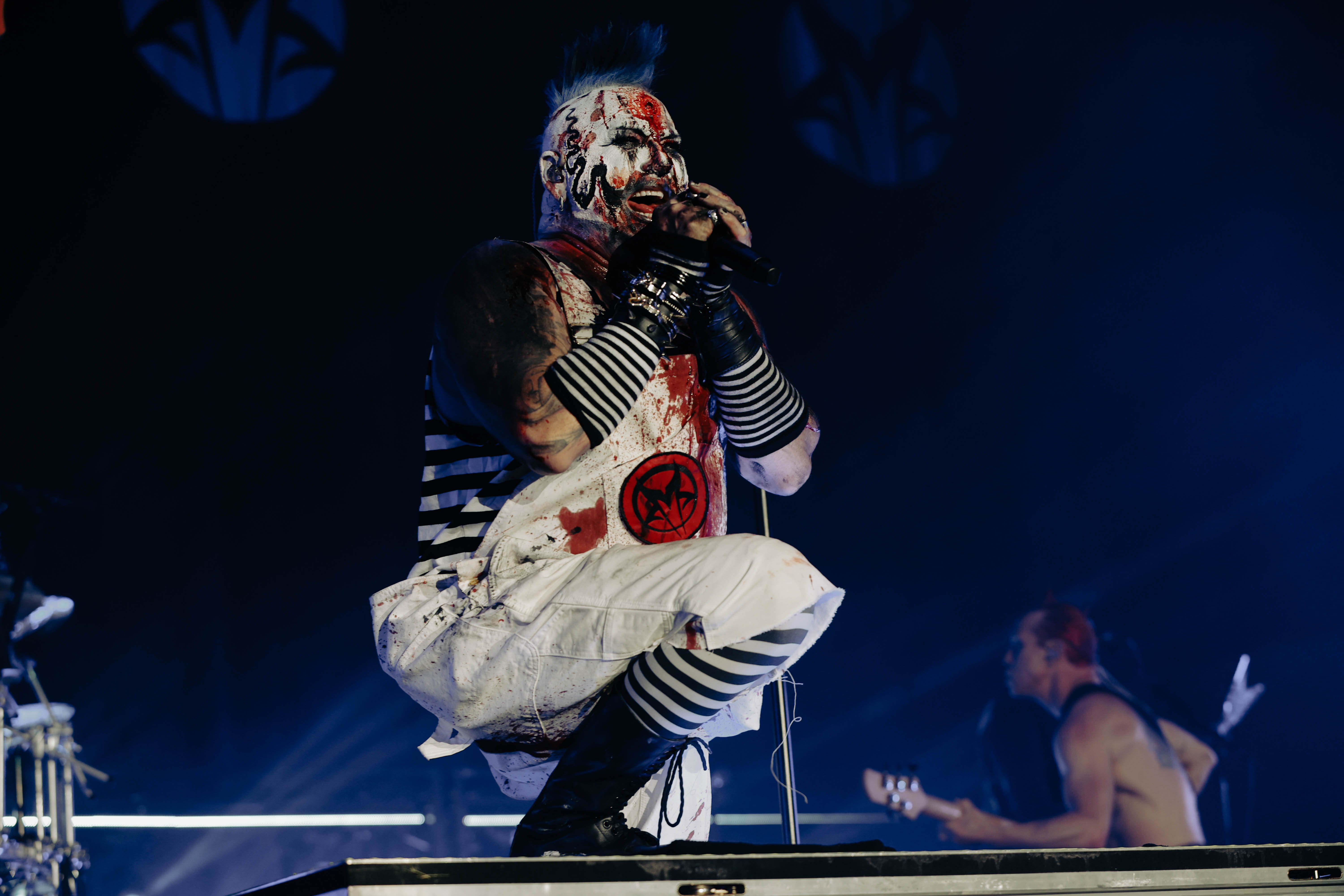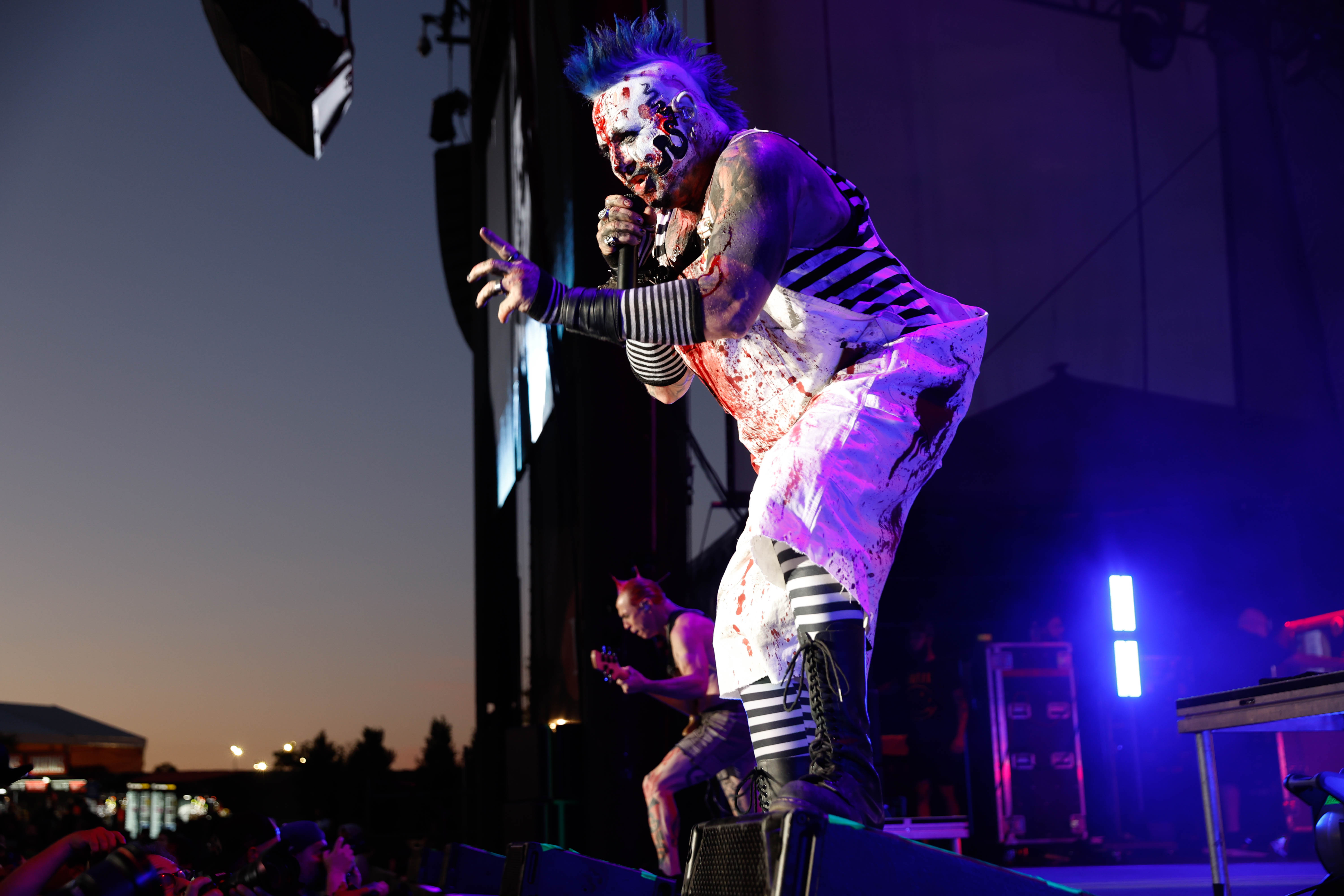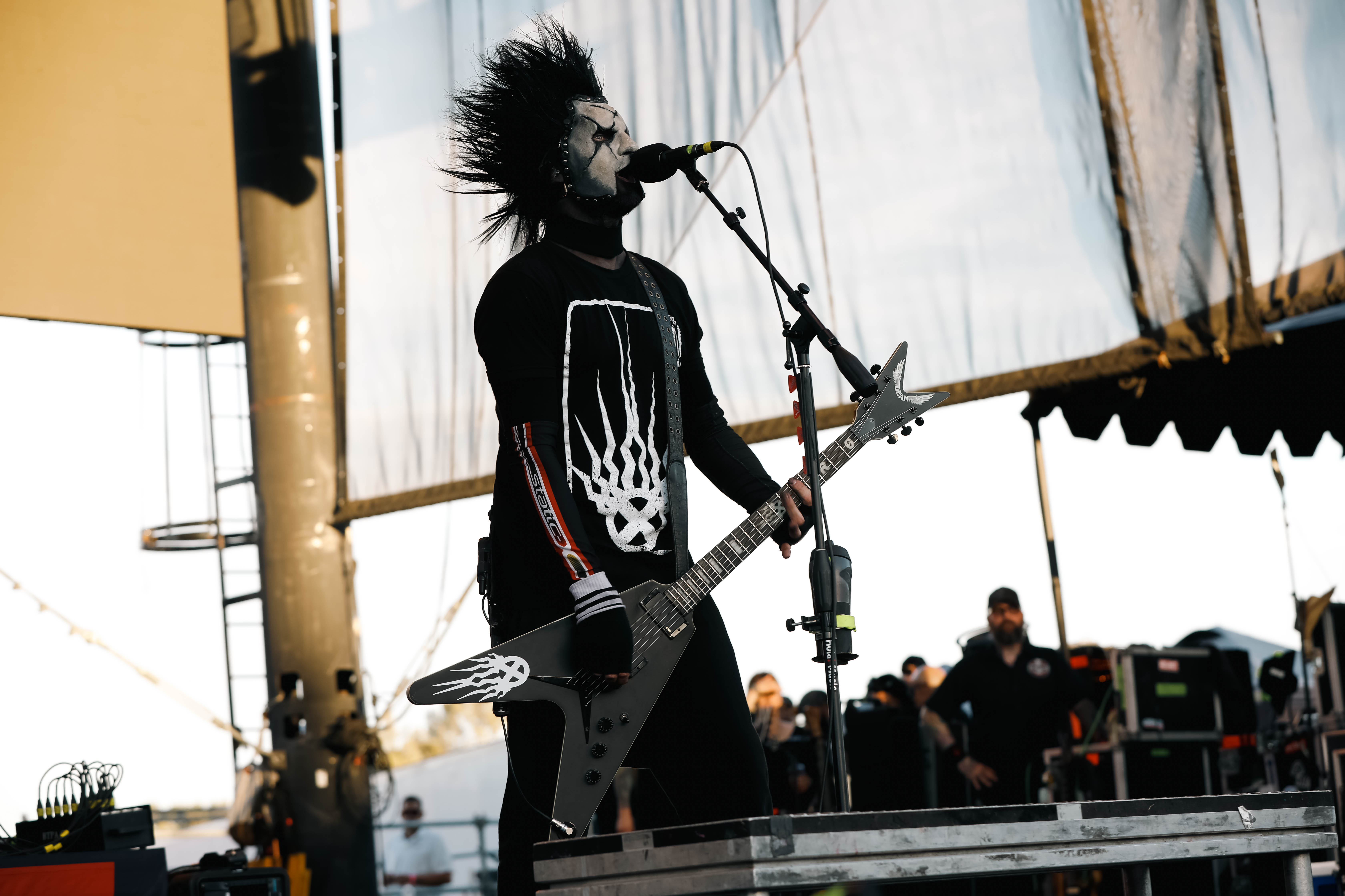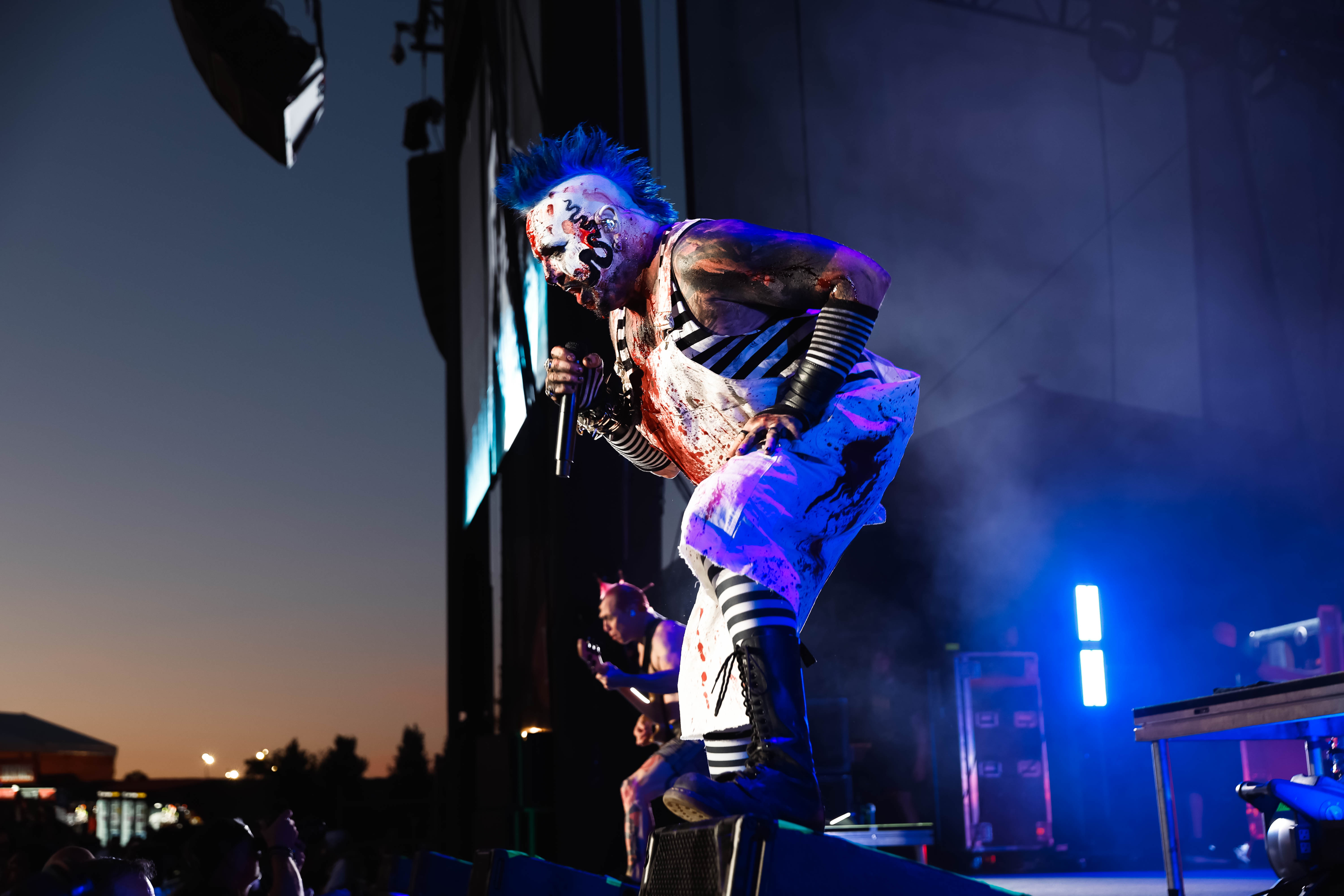 Mudvayne performs dressed in horror-movie style outfits. The 12-song set opened with “Dig,” and included “Death Blooms,” “World So Cold,” and “Happy?”