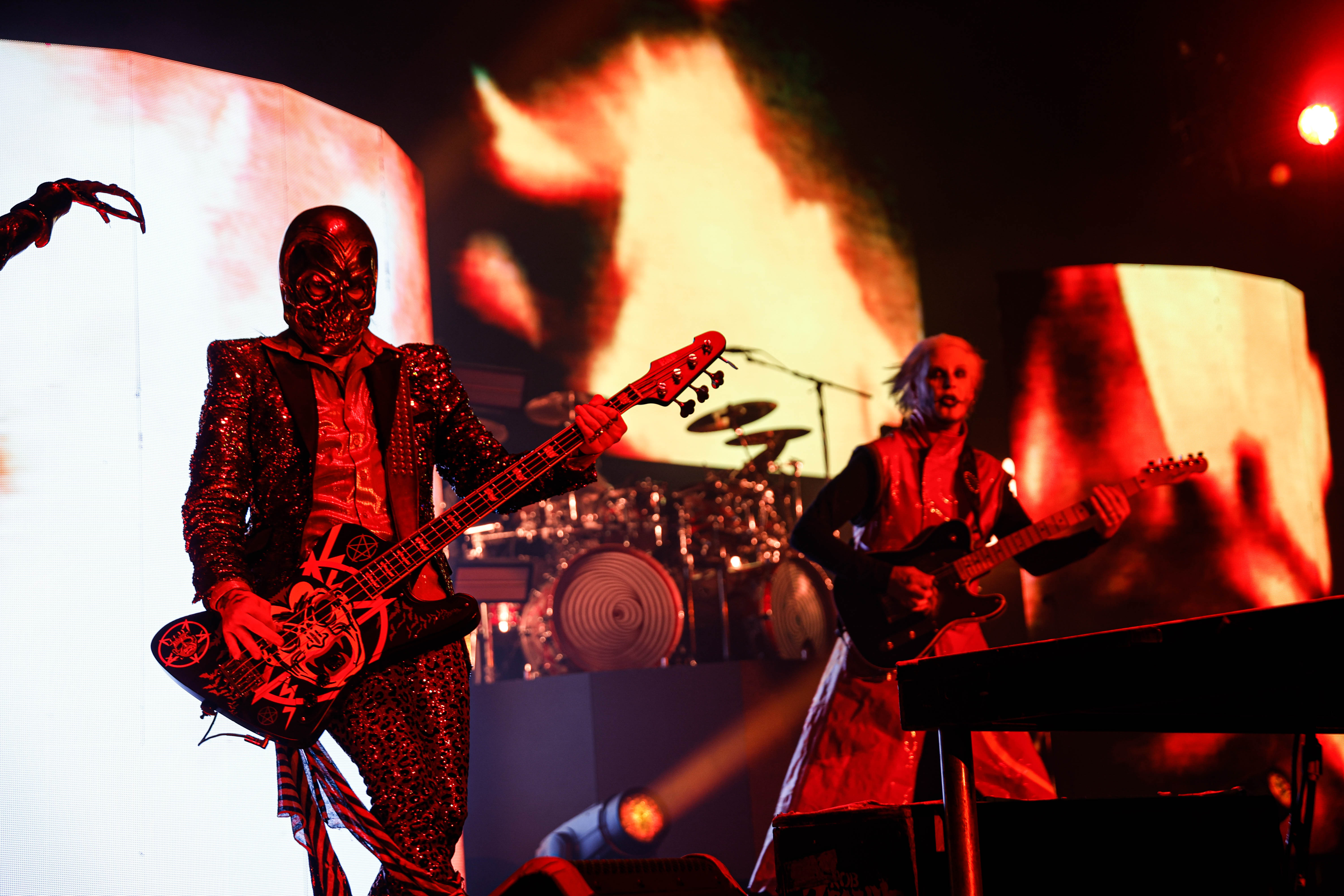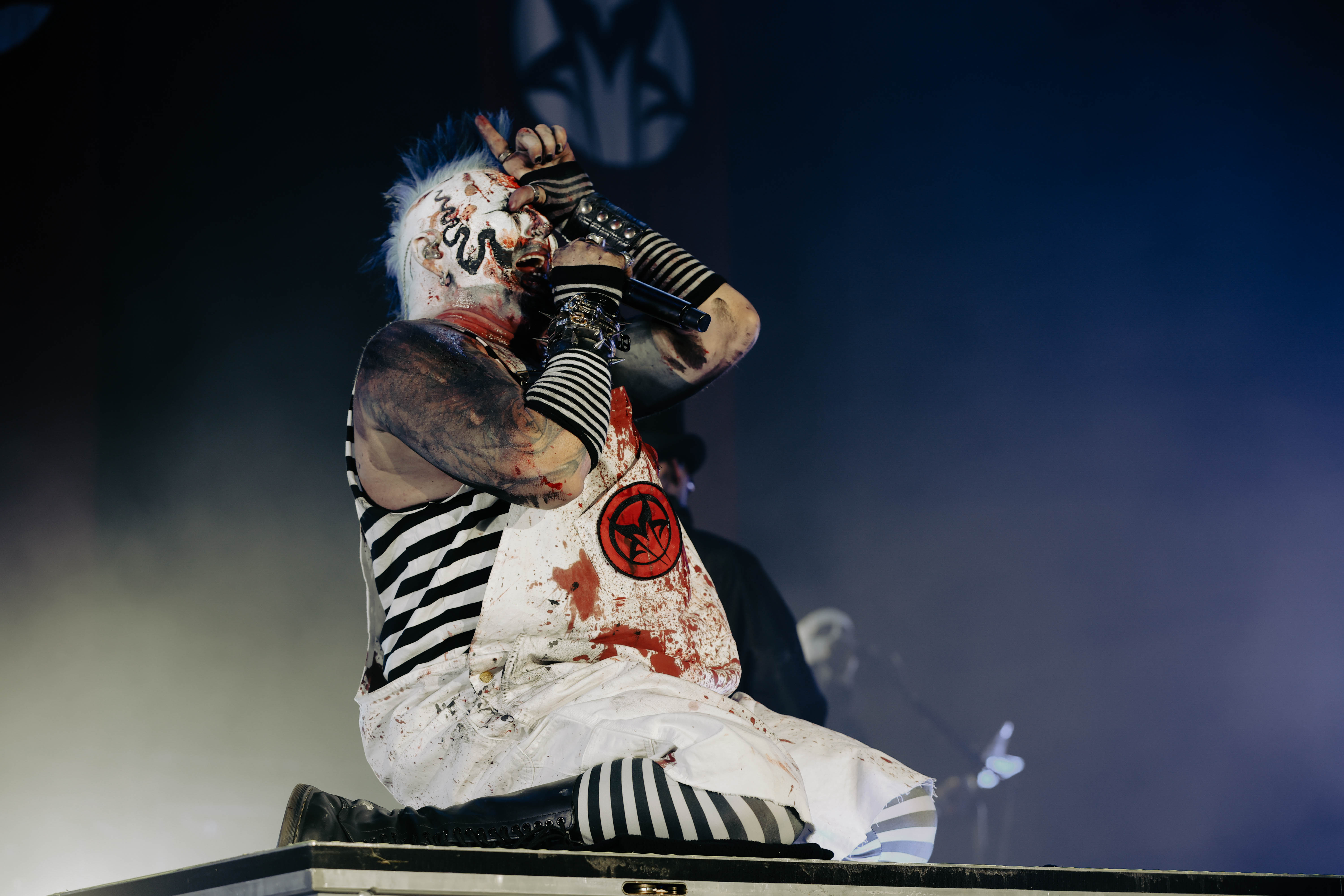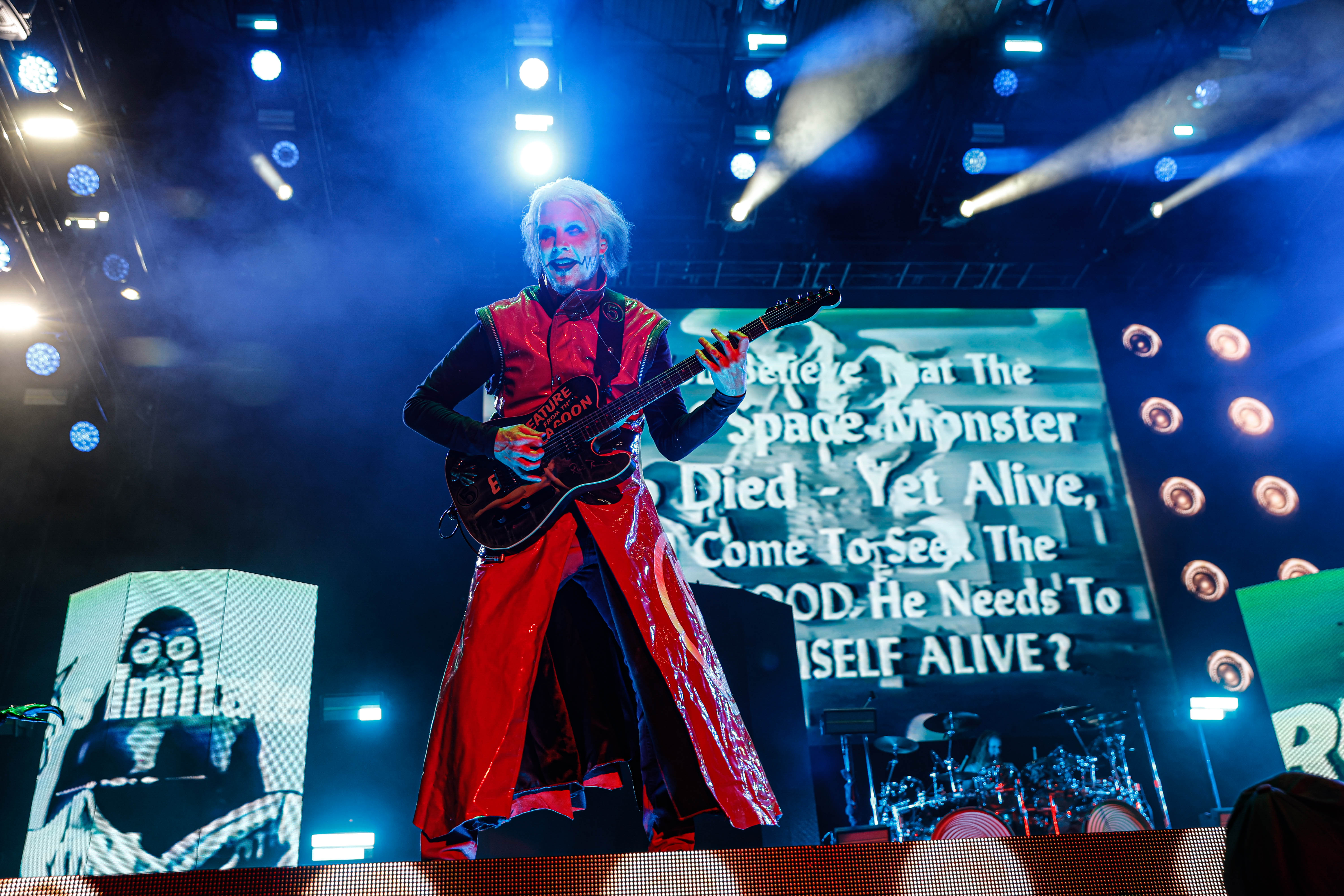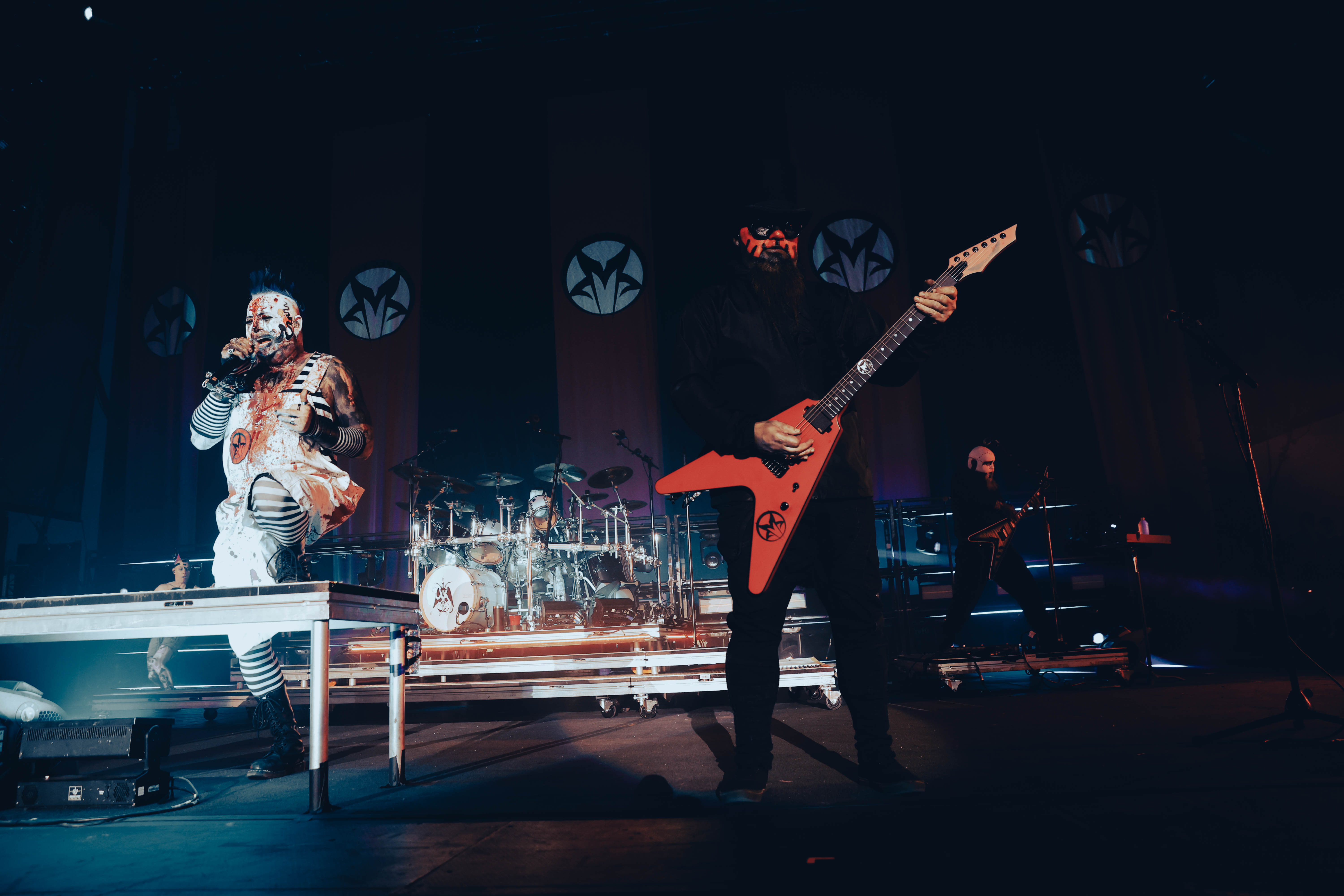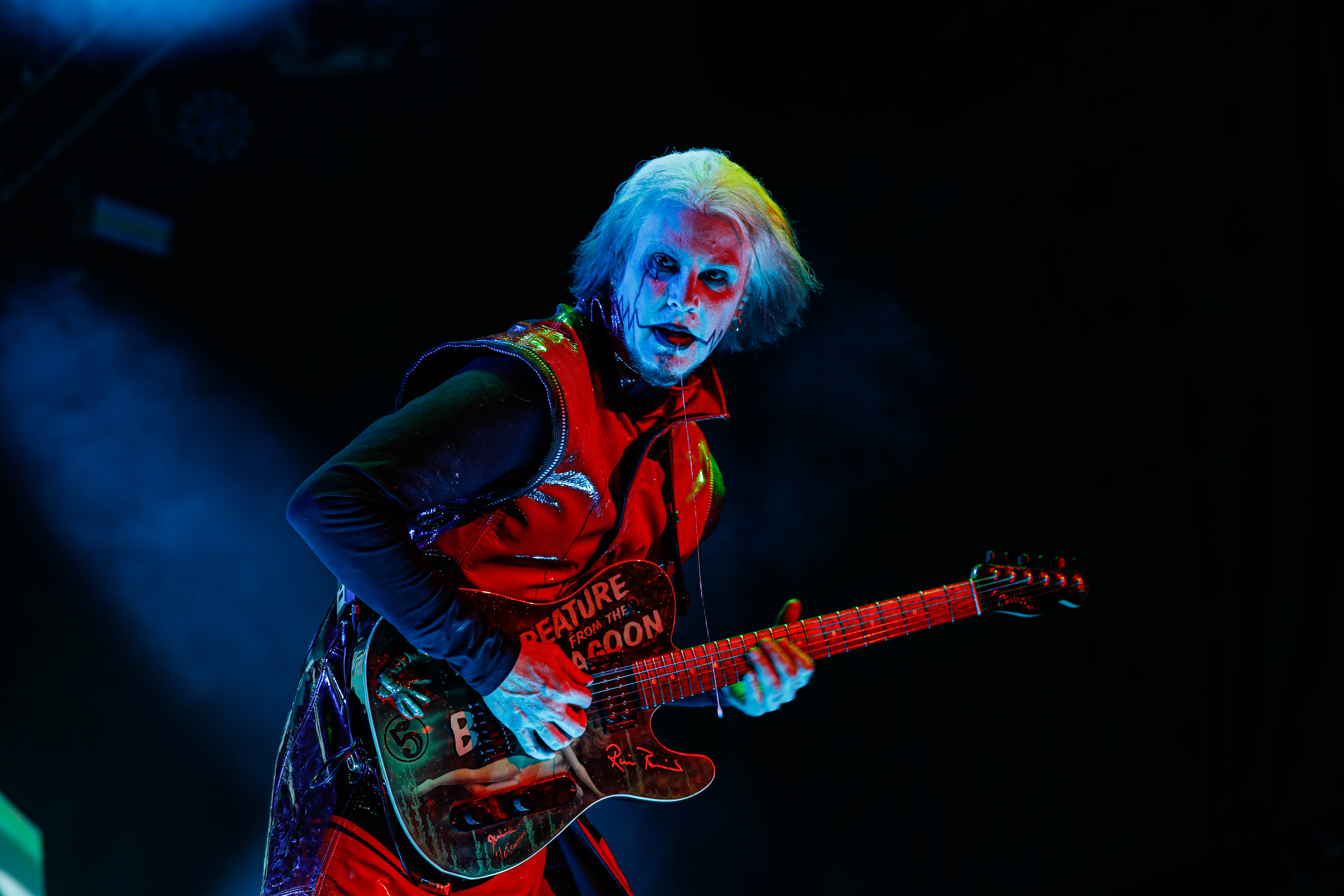 Mudvayne performs dressed in horror-movie style outfits. The 12-song set opened with “Dig,” and included “Death Blooms,” “World So Cold,” and “Happy?”