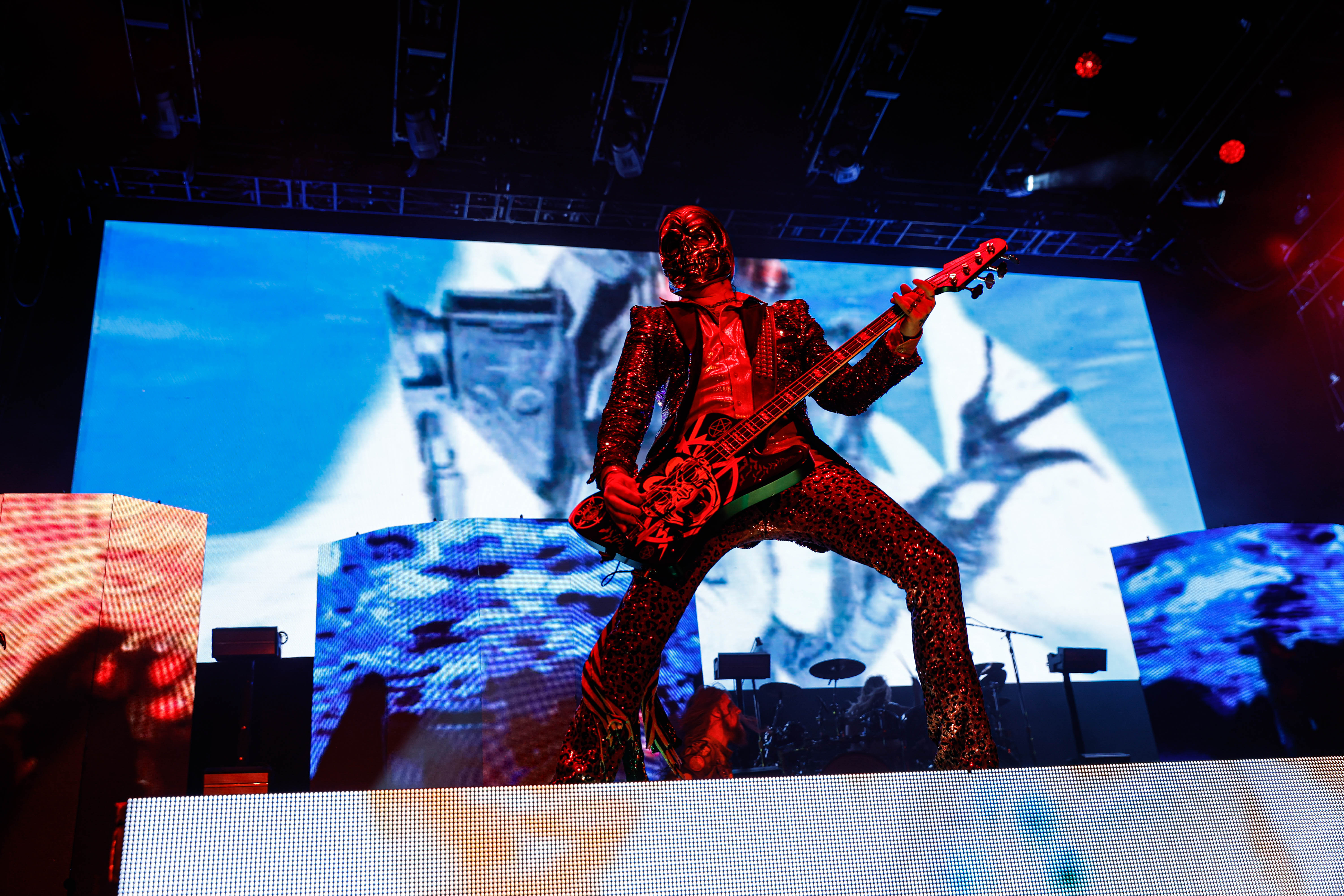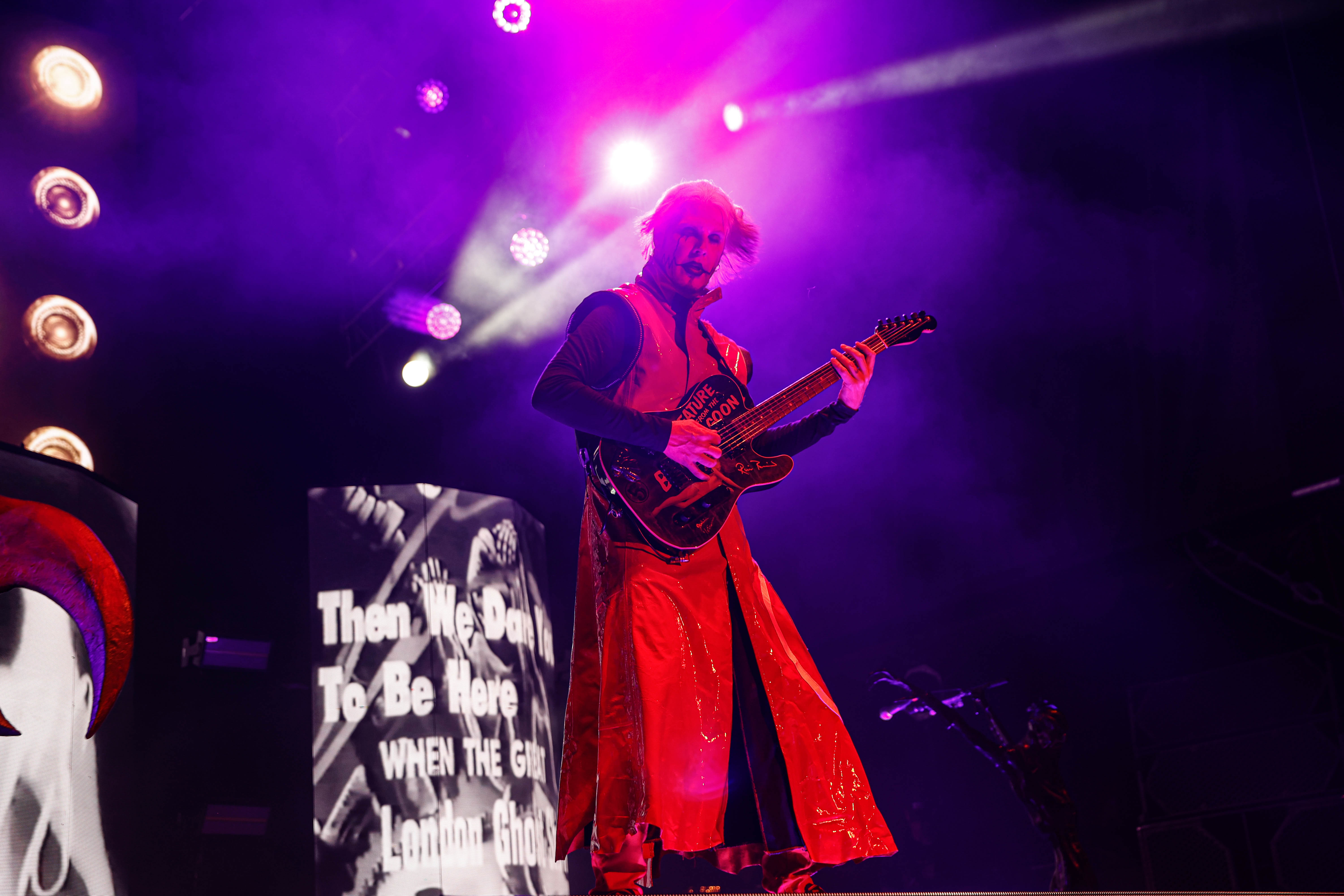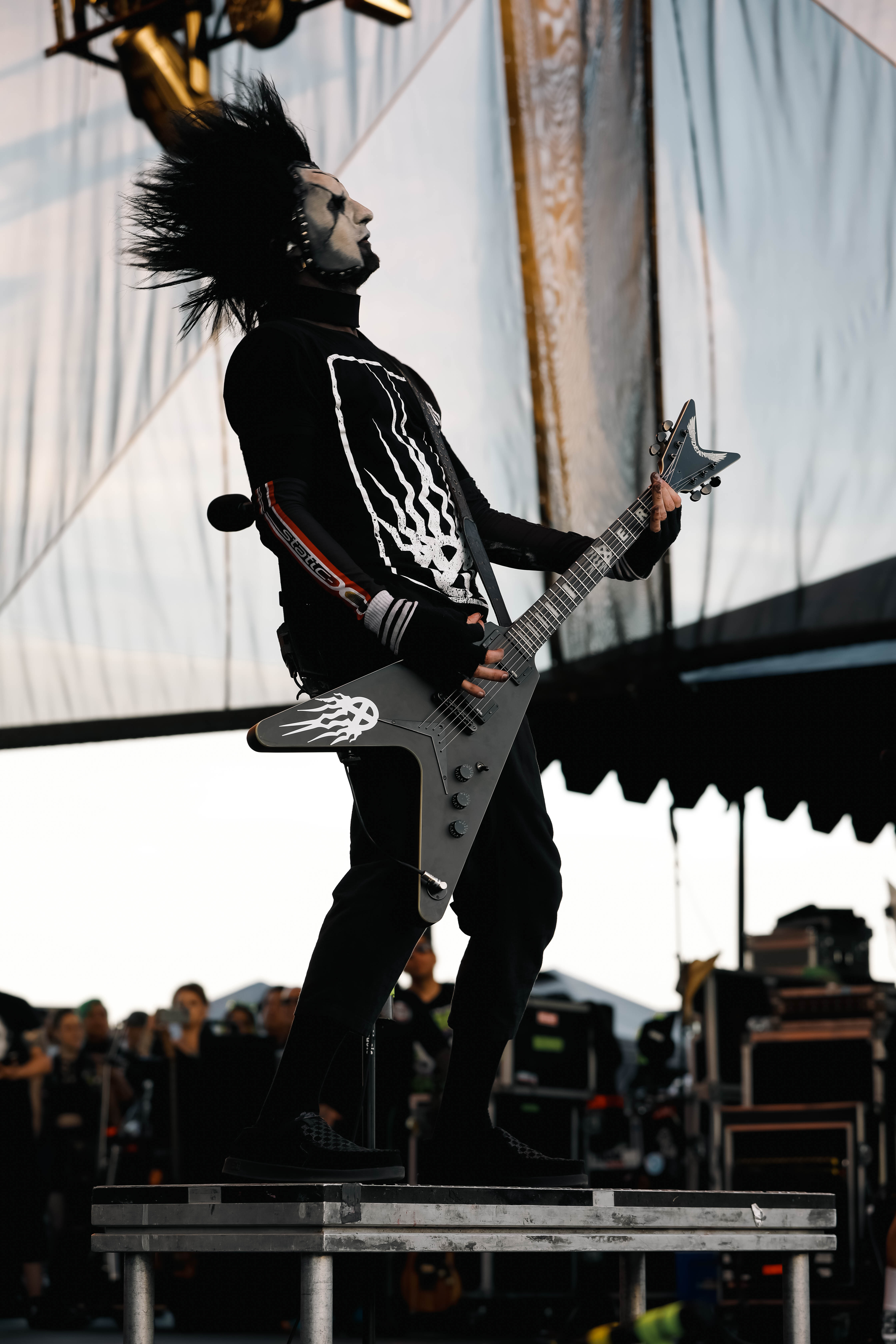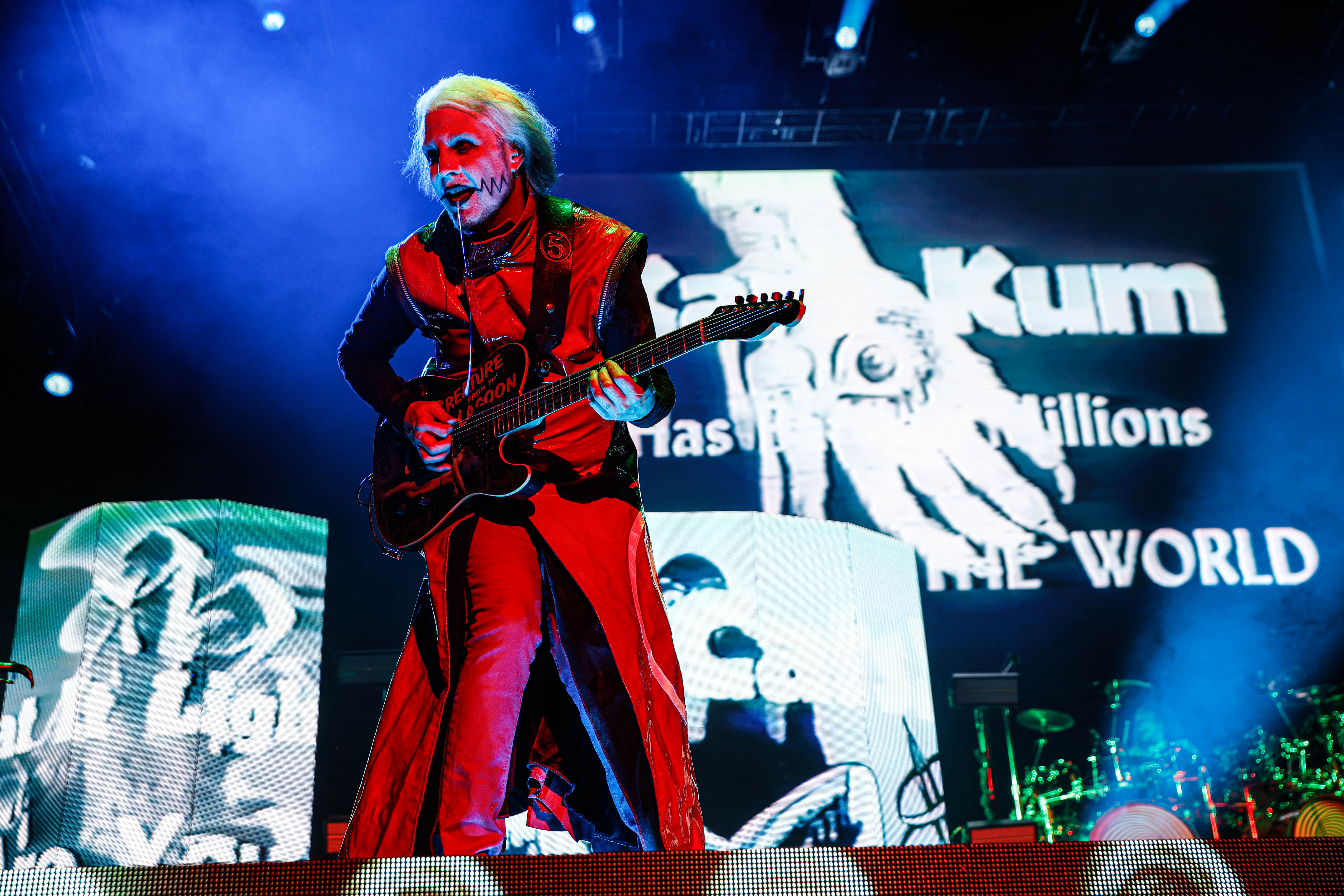 Mudvayne performs dressed in horror-movie style outfits. The 12-song set opened with “Dig,” and included “Death Blooms,” “World So Cold,” and “Happy?”